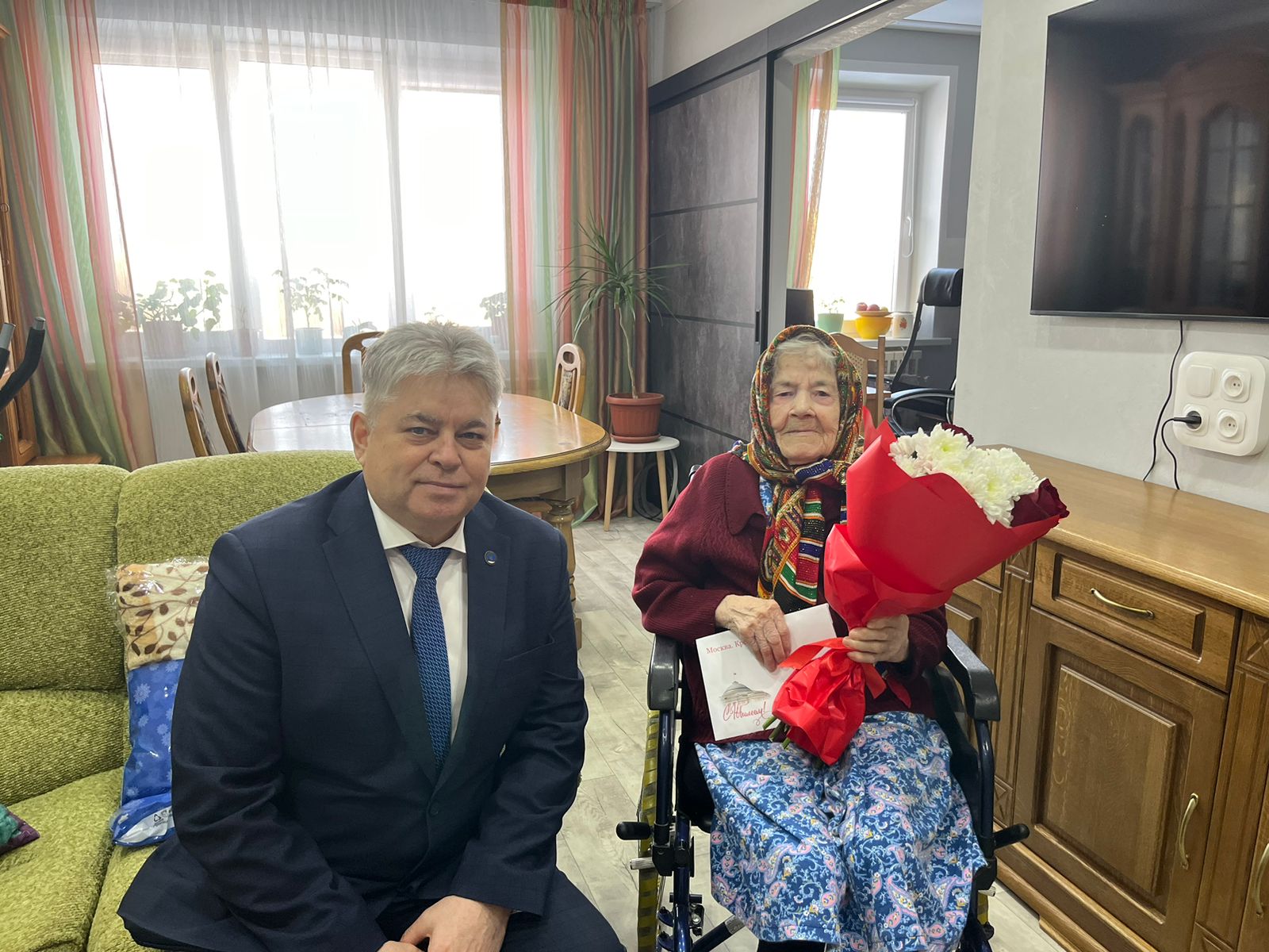 Поздравления и подарки от имени президента РФ Владимира Путина, мэра города Наиля Магдеева и от себя лично юбиляру вручил глава