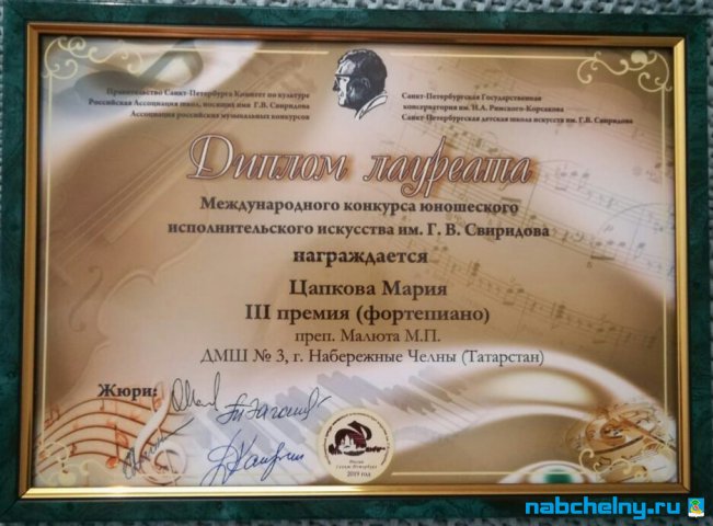 С победой из Санкт–Петербурга вернулись преподаватель ДМШ №3 Марина Малюта и её ученица Мария Цапкова. Юная пианистка участвовала в престижном Международном конкурсе юношеского искусства им. Г.В. Свиридова, прошла во второй тур и стала лауреатом 3 премии. Кроме того, она стала обладательницей специального диплома за лучшее исполнение сочинения Шостаковича.