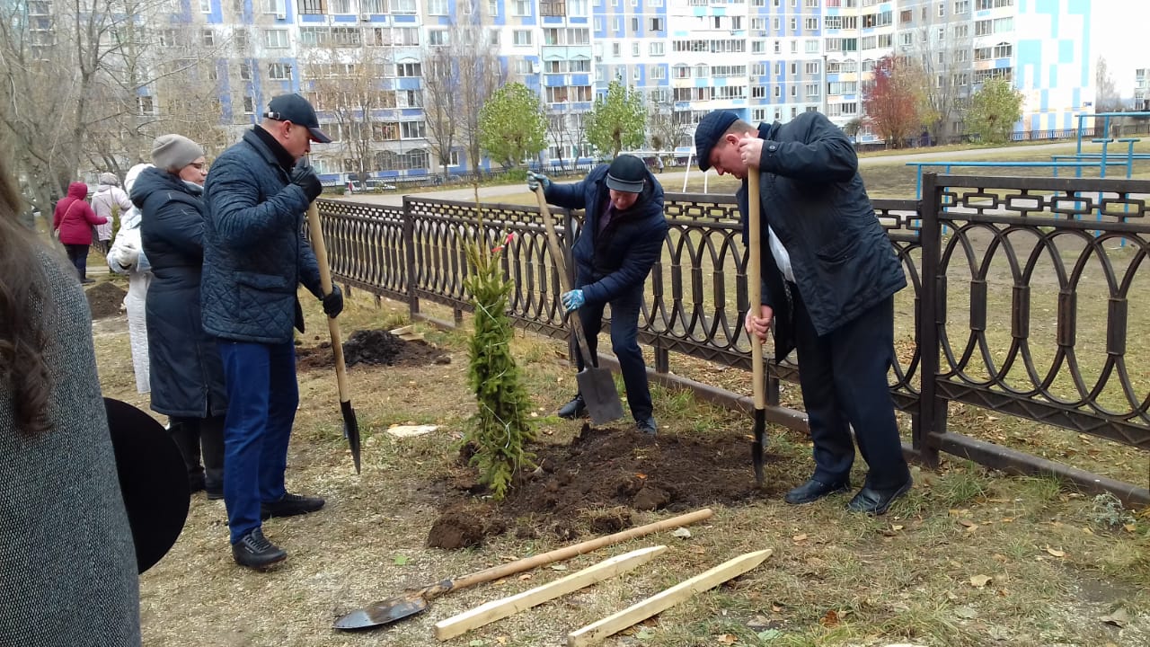 Во дворе дома 38/13-1 при участии депутата Государственного Совета Олега Николаева, депутата Городского Совета Андрея Елантьева, педагогов и учащихся школы № 53 и представителей УК «Махалля» посажены и подготовлены к зиме 15 елей.