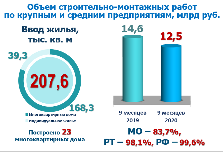 На 1 ноября построено 207,6 тыс. кв. м жилья или 59% к годовому плану, сдано 23 многоквартирных дома. До конца года планируется ввести еще 12 многоквартирных жилых домов, площадью 120,6 тыс. кв. м. В 2020 году всего привлечено 15 млрд руб., в том числе в рамках реализации национальных проектов 2,5 млрд руб.
