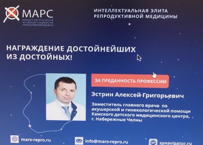 В рамках конгресса наградили лучших представителей акушерства и гинекологии. Представитель из Набережных Челнов - заместитель главного врача по акушерству и гинекологической помощи КДМЦ Алексей Эстрин удостоен награды за преданность профессии и вклад в развитие акушерско-гинекологической службы.