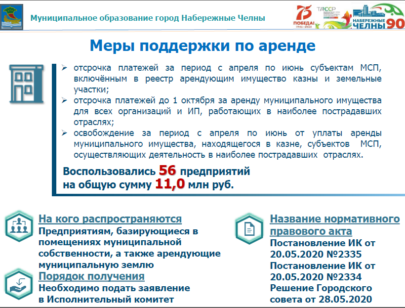 Об антикризисных мерах поддержки в период пандемии рассказала сегодня во время пресс-конференции заместитель руководителя Исполнительного комитета Набережных Челнов Наталия Кропотова. Она отметила, что предпринимательский сектор формирует 35% экономики и бюджета города. «Несмотря на пандемию оборот субъектов малого и среднего предпринимательства вырос на 23,7%. Поддержку, которая была оказана на государственном уровне, мы почувствовали на результатах деятельности предприятий», - сказала она.