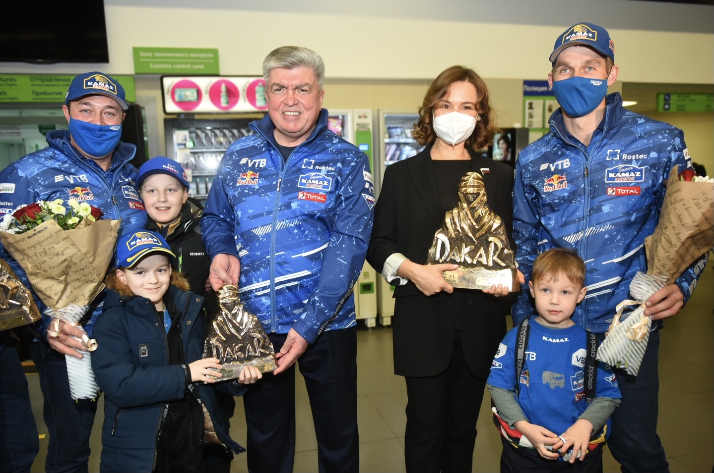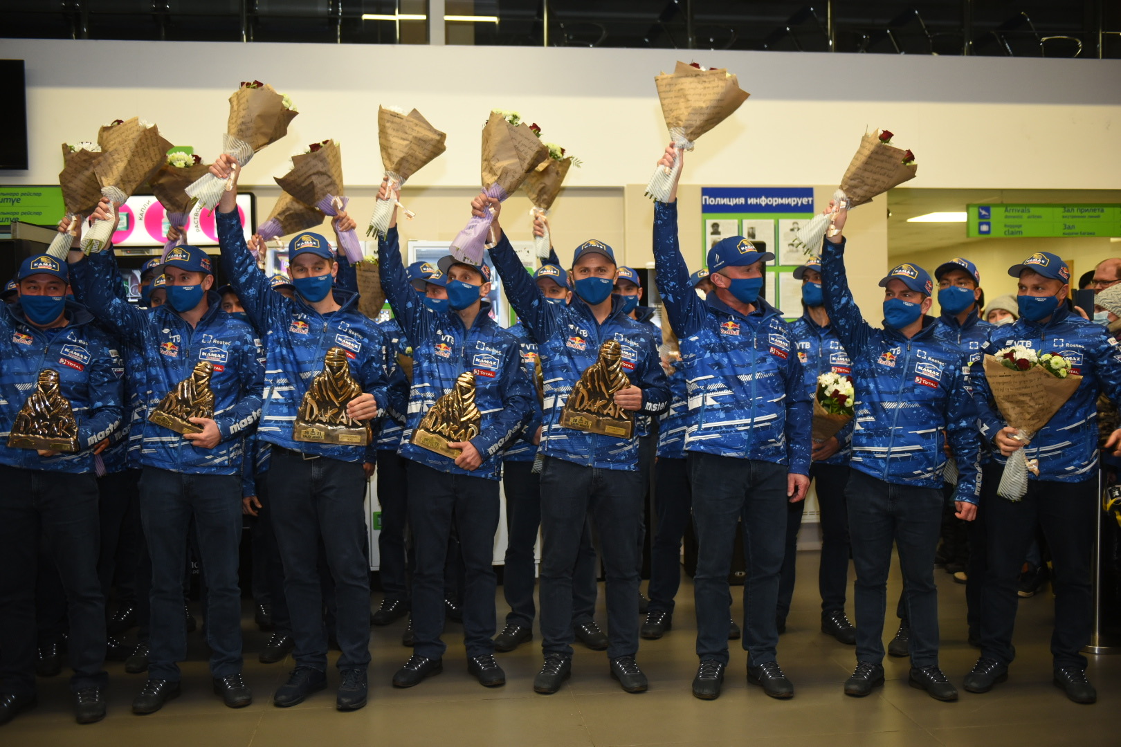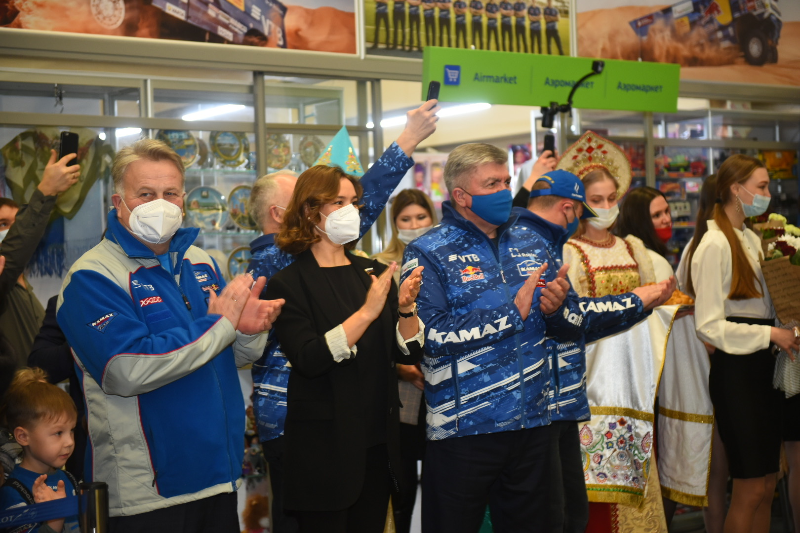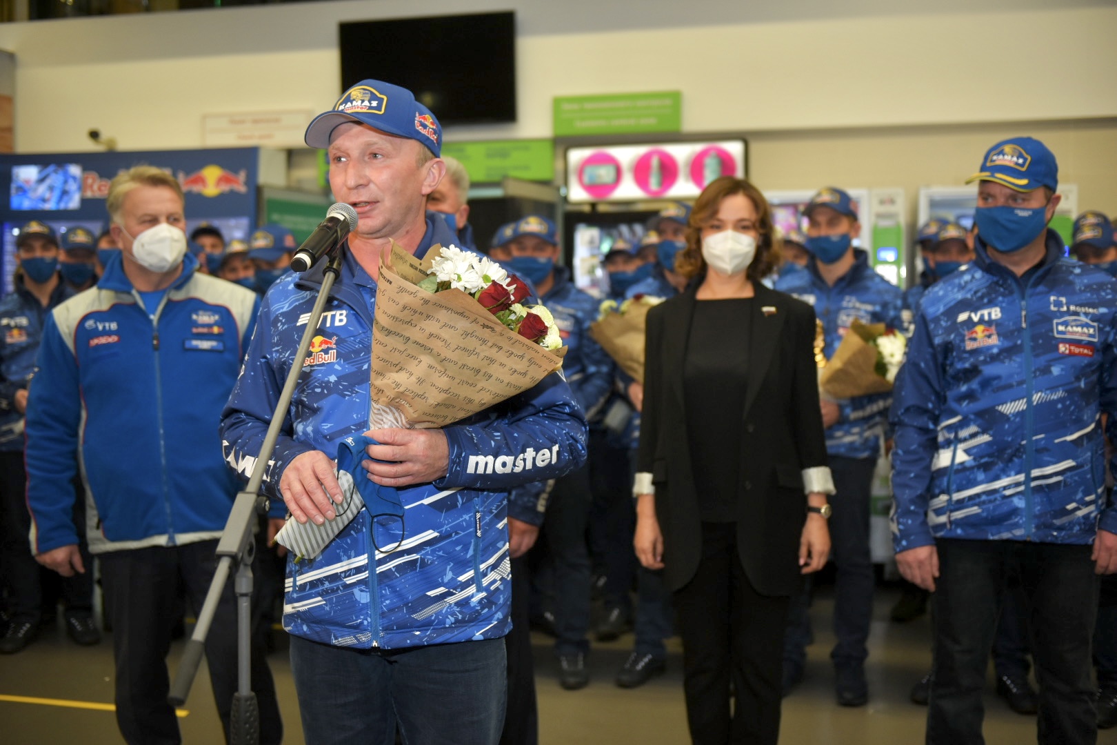 В Набережных Челнах встретили чемпионов «Дакар-2021» команду «КАМАЗ-мастер». В торжественном мероприятии, которое состоялось в аэропорту Бегишево, приняли участие мэр города Наиль Магдеев, депутат Государственной Думы РФ Альфия Когогина, заместитель генерального директора ПАО «КАМАЗ» Юрий Герасимов, председатель профсоюза работников ПАО «КАМАЗ» Кирилл Пузырьков, руководитель команды Владимир Чагин, а также родные и близкие спортсменов, болельщики команды.