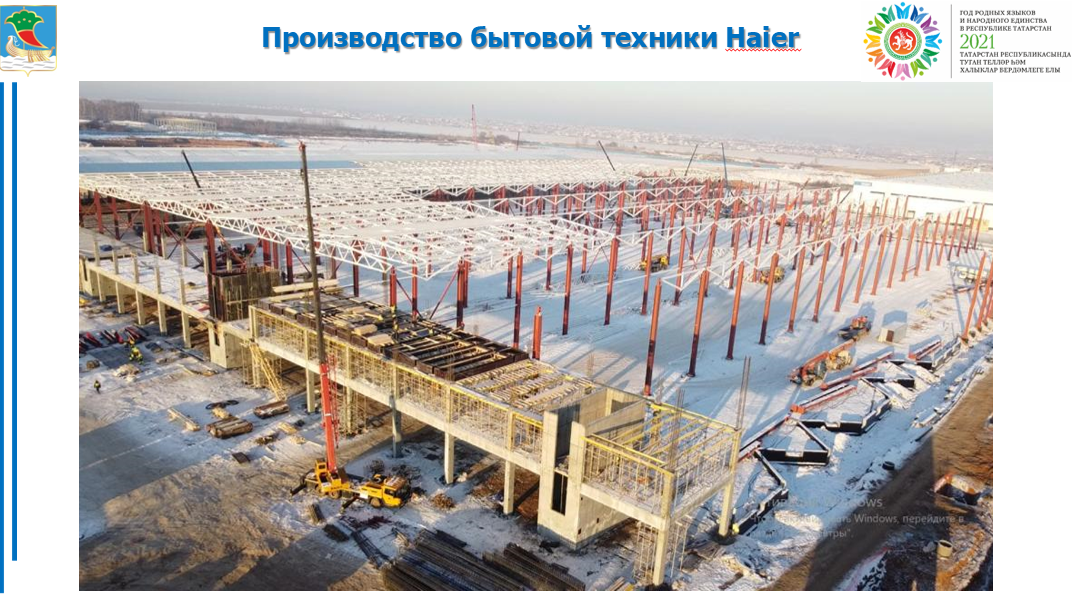 Кроме того, компанией Хайер продолжается реализация крупномасштабного инвестиционного проекта по производству бытовой техники, строится завод по производству телевизоров и склад готовой продукции общей площадью 64 тыс.кв.м.