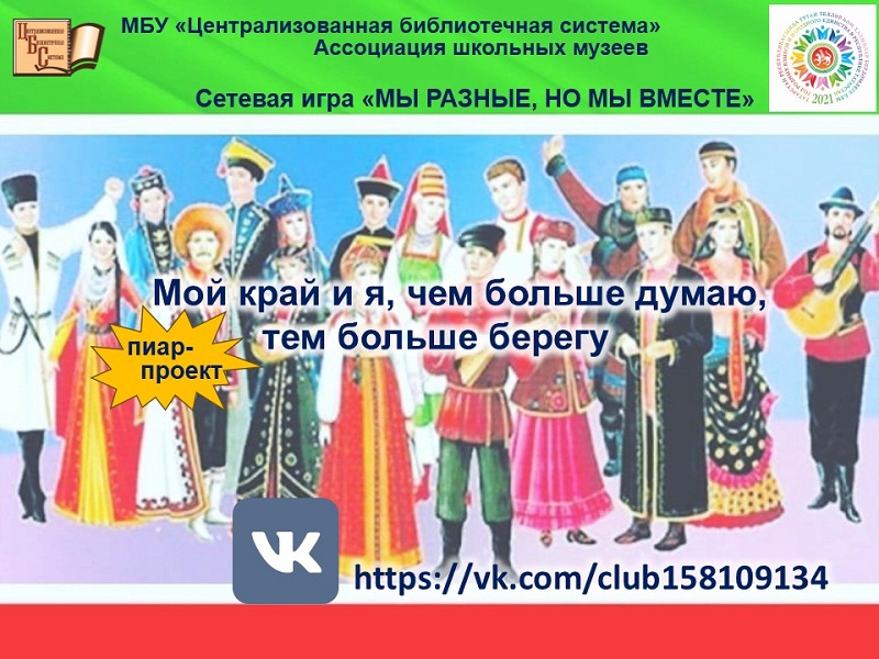 В Центральной городской библиотеке стартовала сетевая игра «Мы разные, но мы вместе», который проходит в рамках ежегодного пиар-проекта «Мой край и я, чем больше думаю, тем больше берегу». Проект проходит уже четвертый год. Каждый год команды-участники выполняют задания связанные с культурой, историей, природой Татарстана и Набережных Челнов. В этом году проект приурочили к Году родного языка и народного единства, объявленного по Республике Татарстан. Проект рассчитан на активистов школьных музеев и любителей родного края.