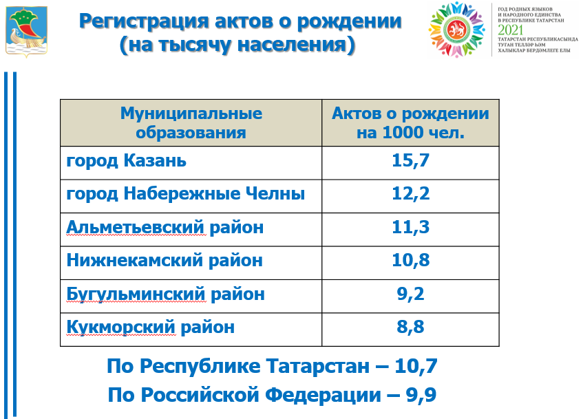 За 2020 год в Набережных Челнах зарегистрировано рождение 6736 детей. Из года в год мальчиков рождается больше. Их количество составило 3437 человек. Пик рождаемости пришелся на июнь – 617детей. Меньше всего ребятишек родилось в январе – 500 человек. Максимальный вес ребенка составил 5кг 300г. Самый маленький малыш весил – 620 граммов.