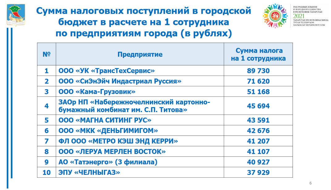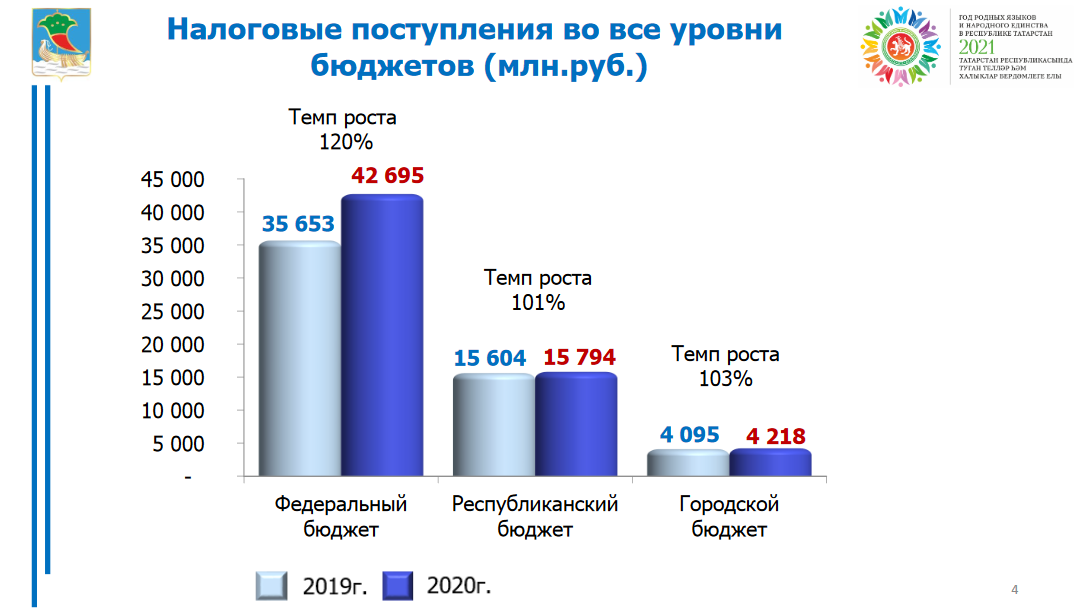 Налоговые поступления в бюджеты всех уровней за 2020 год в Набережных Челнах составили 62,7 млрд рублей, что на 13% больше уровня 2019 года. В федеральный бюджет мобилизовано 42,7 млрд. рублей, в бюджет республики – 15,8 млрд рублей, в бюджет города - 4,2 млрд рублей. Рост поступлений в городской бюджет составил 123 млн рублей или 103% к уровню 2019 года. Об этом сообщила начальник налоговой службы Набережных Челнов Диана Сагетдинова.