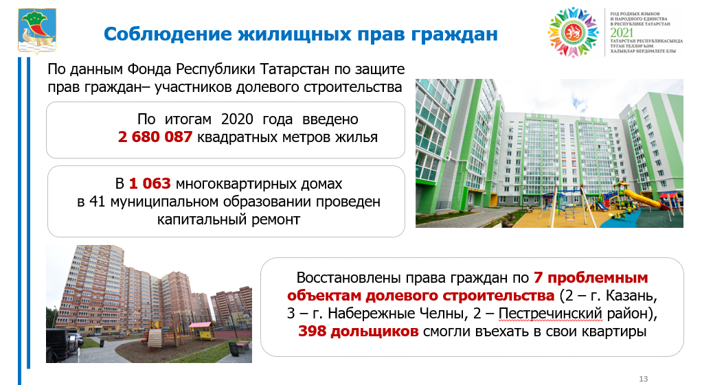 В течение года велась активная работа по завершению строительства проблемных объектов долевого строительства. Согласно данным Фонда Республики Татарстан по защите прав граждан – участников долевого строительства, в 2020 году введены в эксплуатацию шесть проблемных объектов долевого строительства, восстановлены права 398 дольщиков по 7 объектам (2 - Казань, 3 - Набережные Челны, 2 - Пестречинский муниципальный район). Об этом сообщила общественный помощник Уполномоченного по правам человека в Республике Татарстан Эльвира Мифтахова. «В адрес общественного помощника по городу Набережные Челны обращений по вопросу нарушения жилищных прав не поступало», - сказала она.