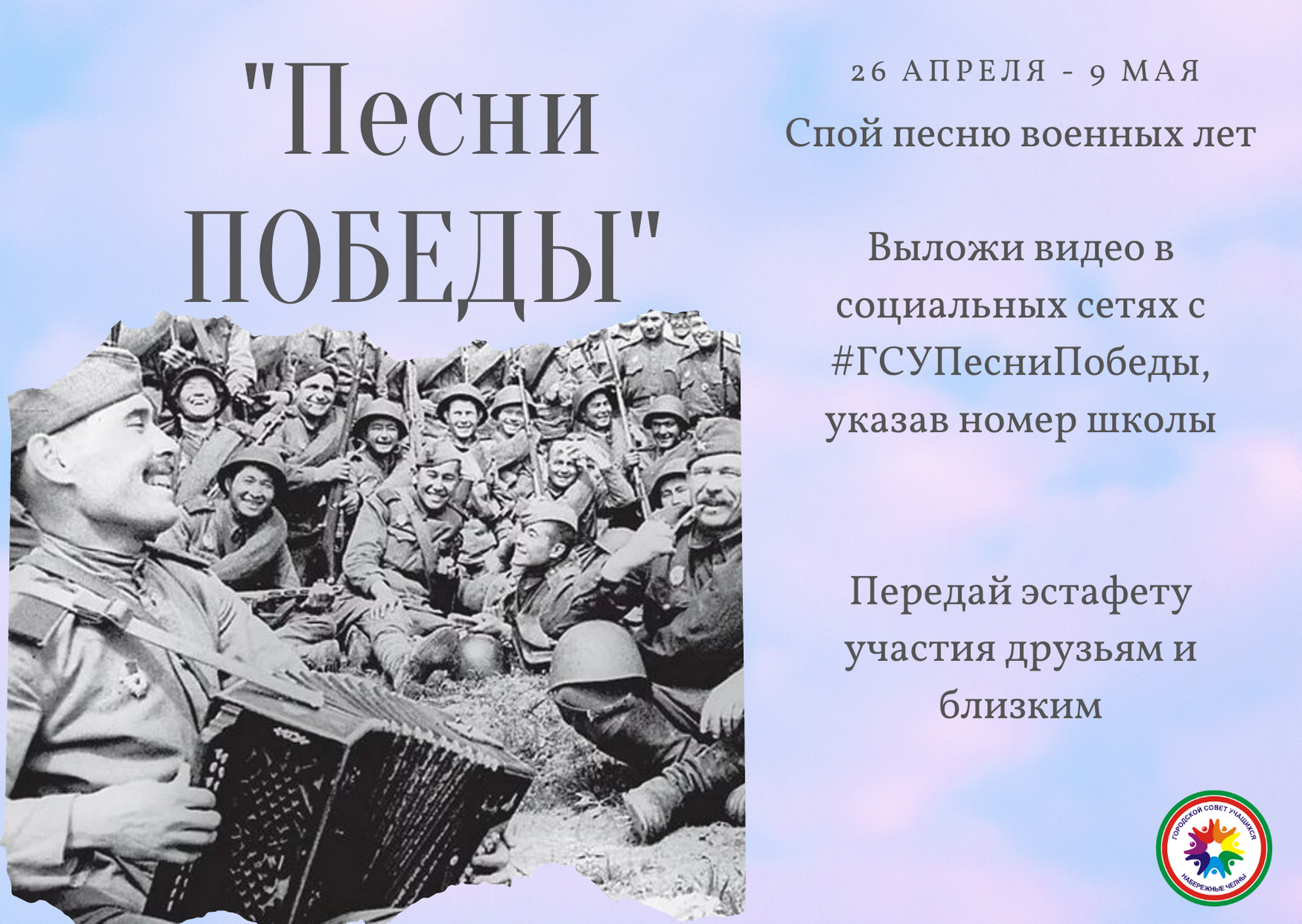 В преддверии Дня Победы Городской совет учащихся, Набережночелнинское отделение «Российское движение школьников» при поддержке Управления образования запускает акции памяти: «Песни Победы», «Окна Победы», «Звезда Героя».