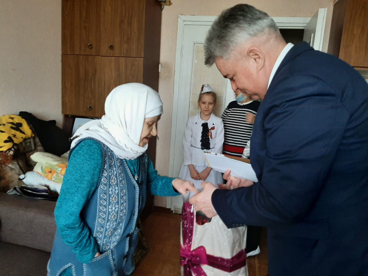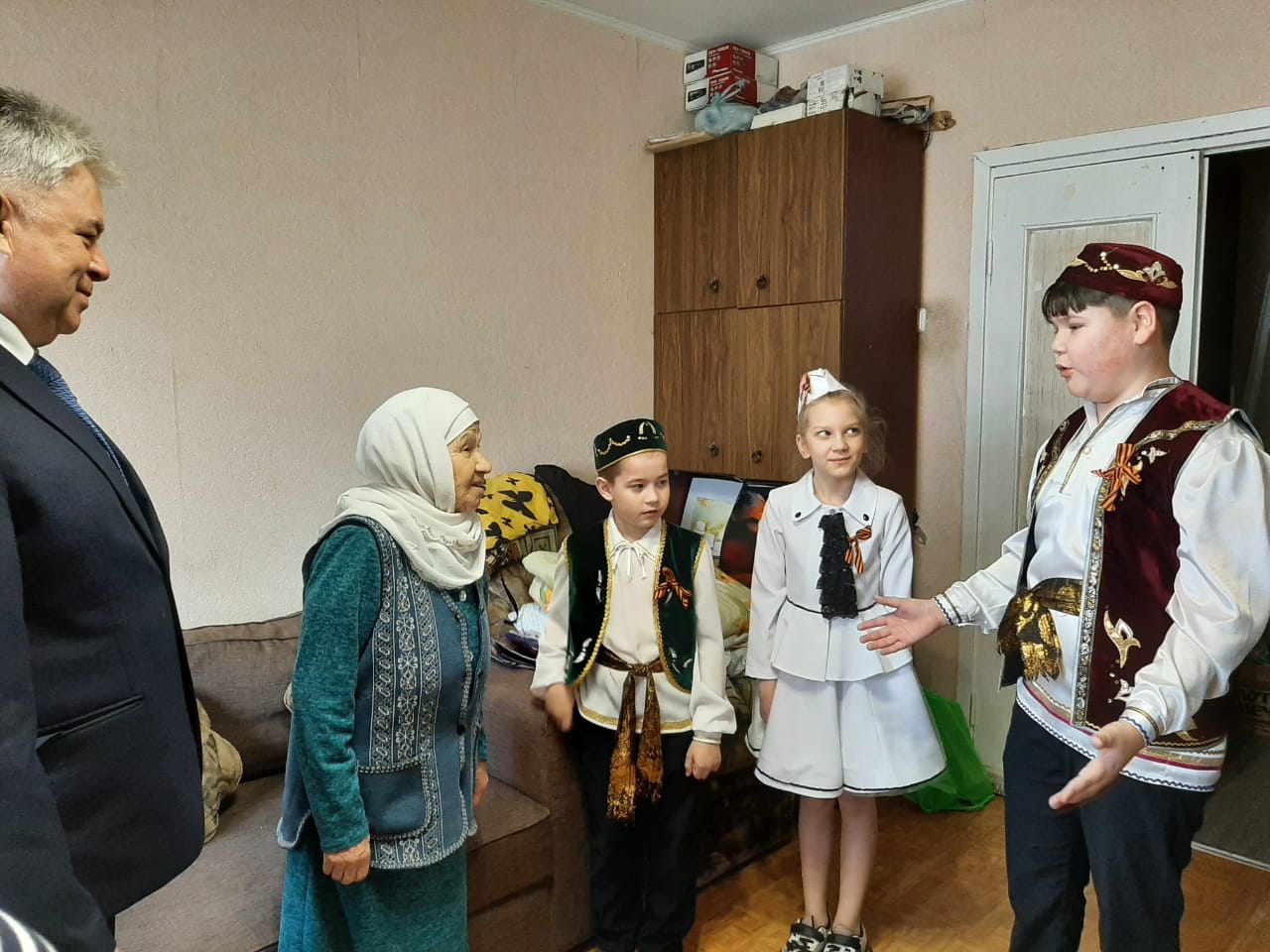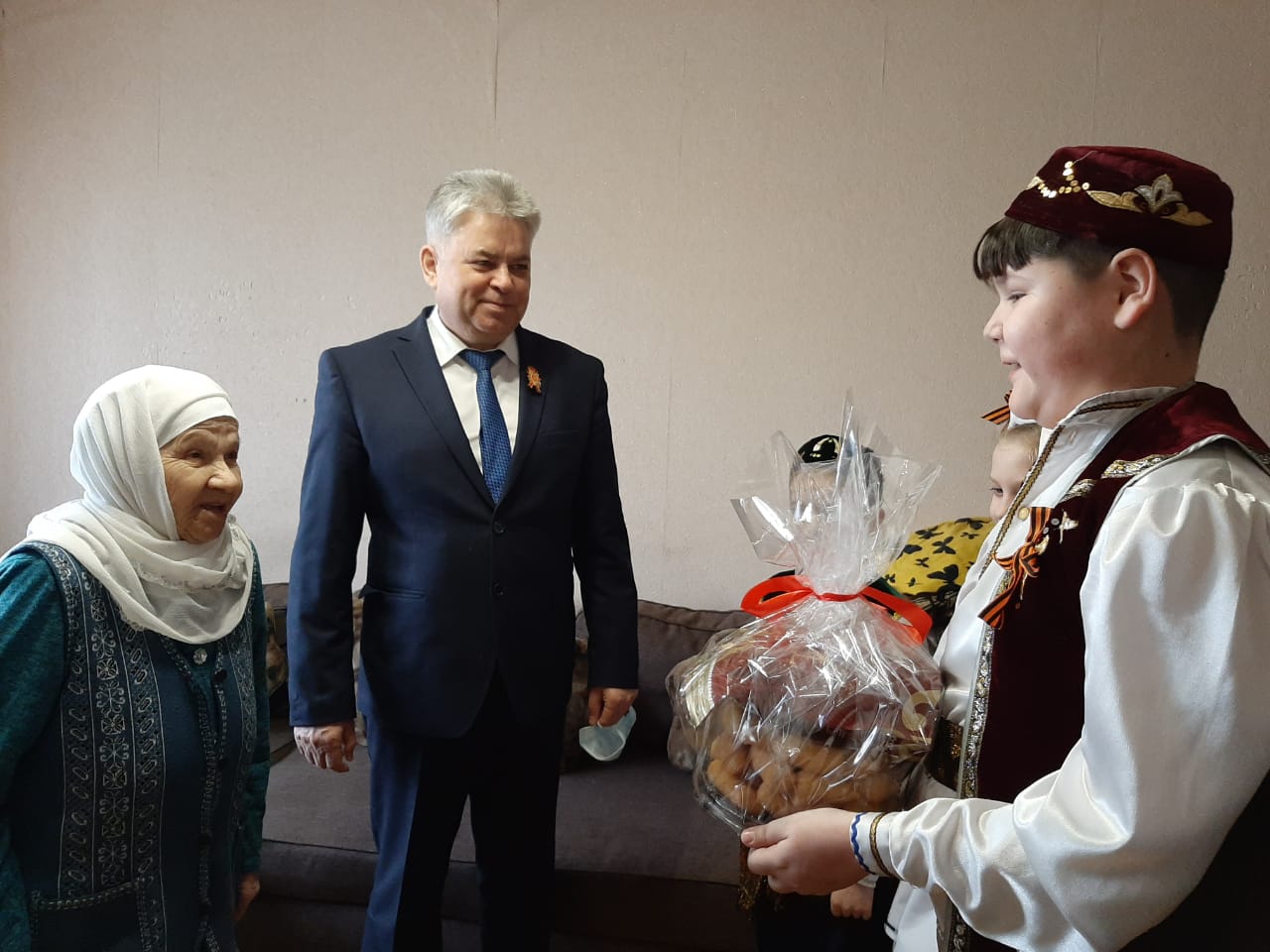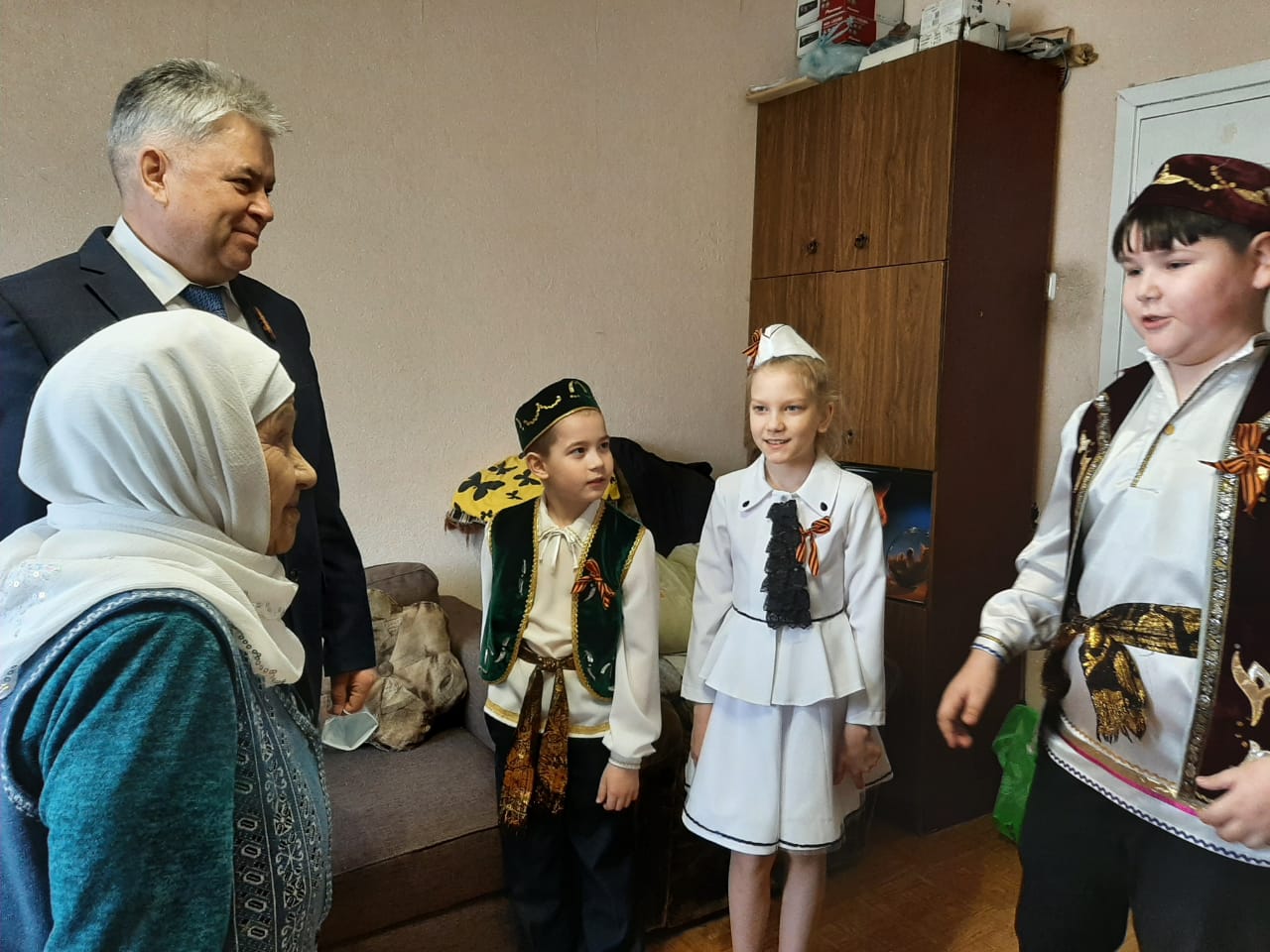 Глава Автозаводского района Винер Харисов поздравил ветеранов на ддому. К поздравлениям участника Великой Отечественной войны Мухтасима Фарукшина присоединились и ученики школы №19. Учащиеся у дверей ветерана провели акцию «Красная звезда».