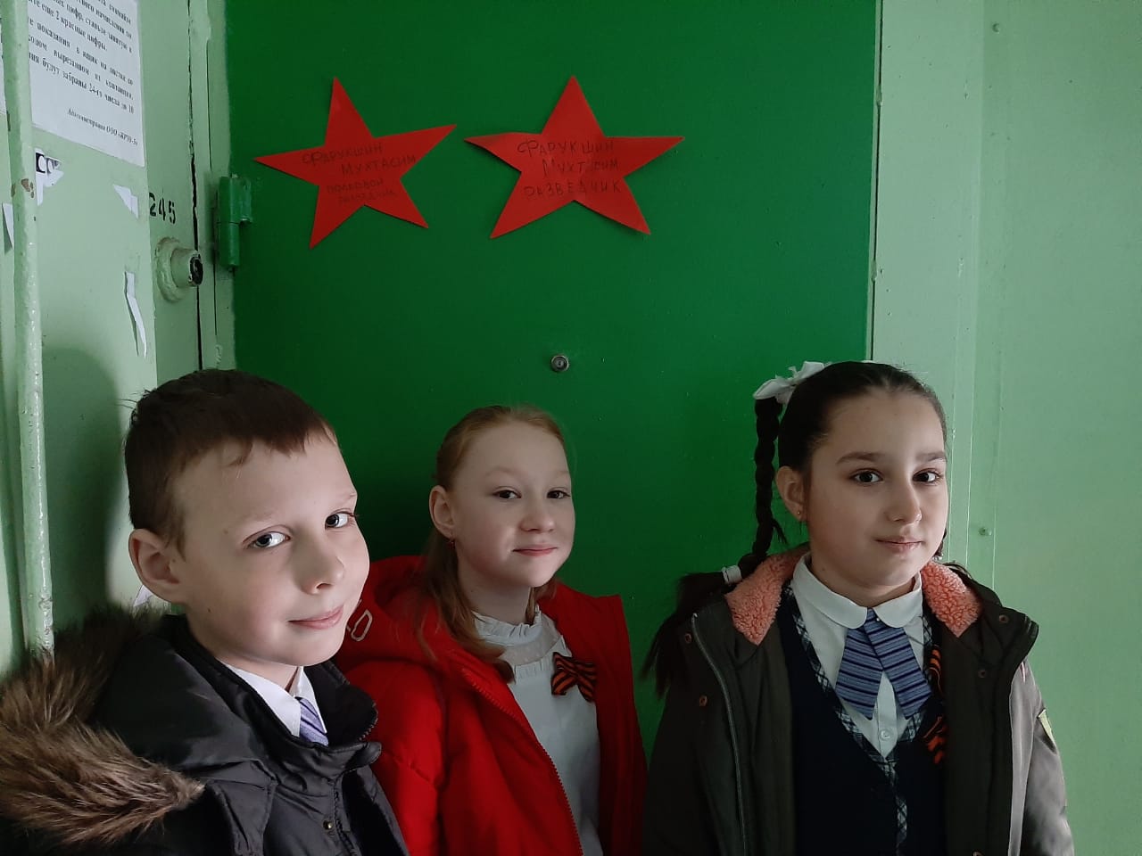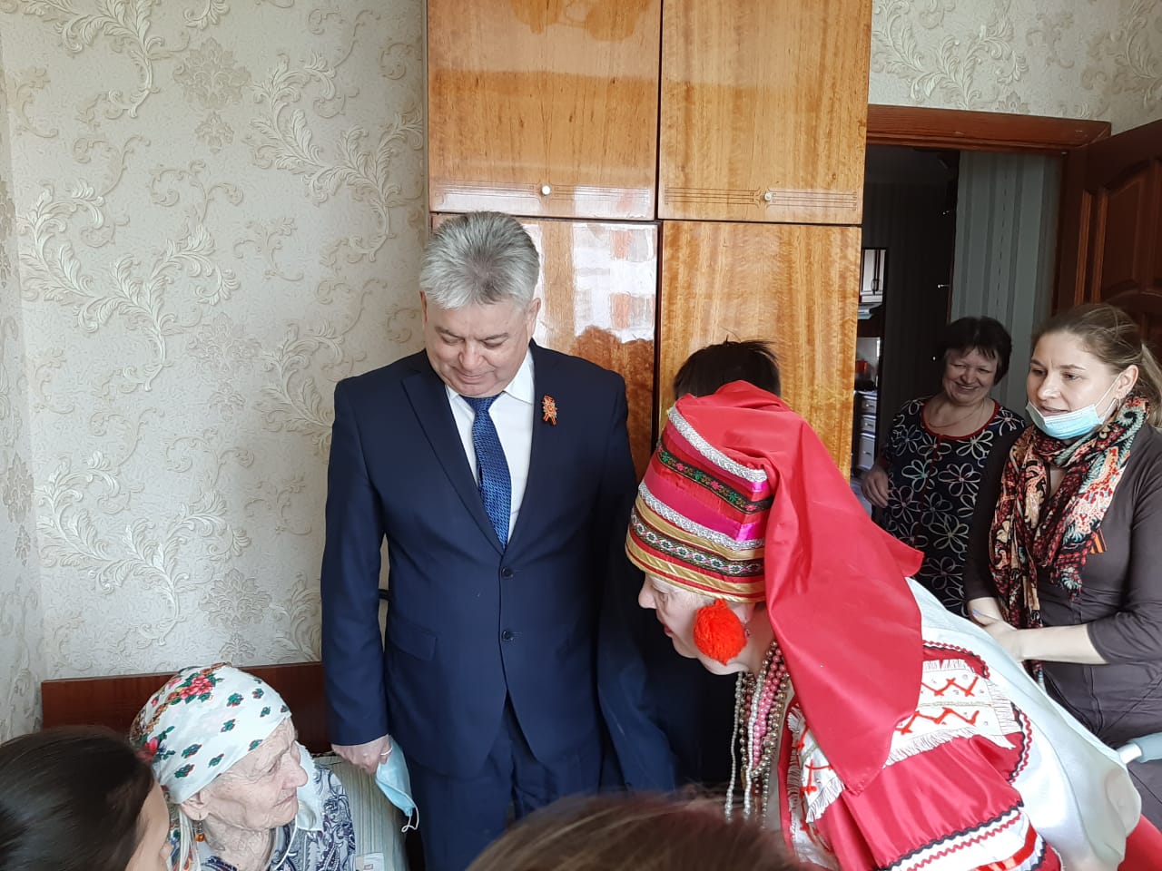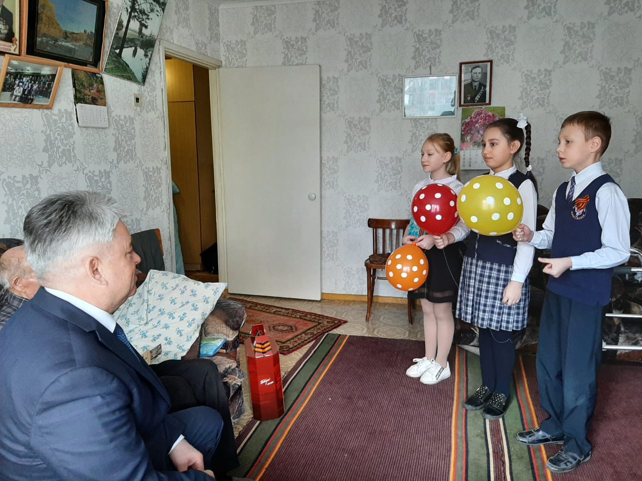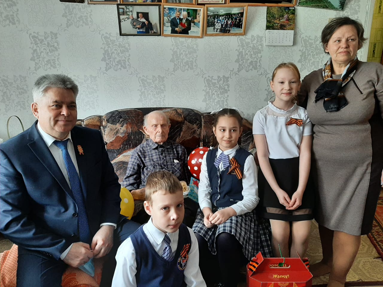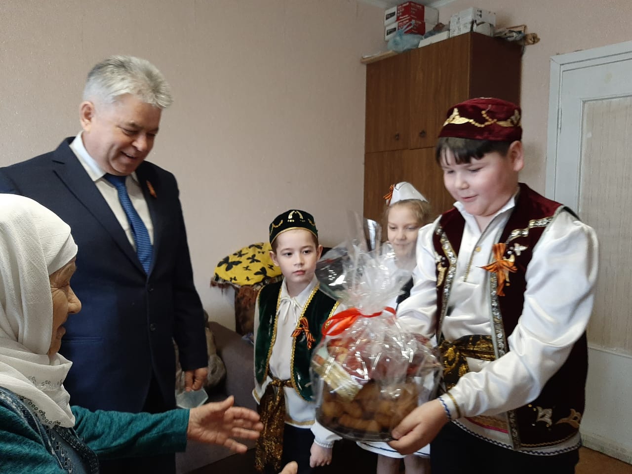 Глава Автозаводского района Винер Харисов поздравил ветеранов на ддому. К поздравлениям участника Великой Отечественной войны Мухтасима Фарукшина присоединились и ученики школы №19. Учащиеся у дверей ветерана провели акцию «Красная звезда».