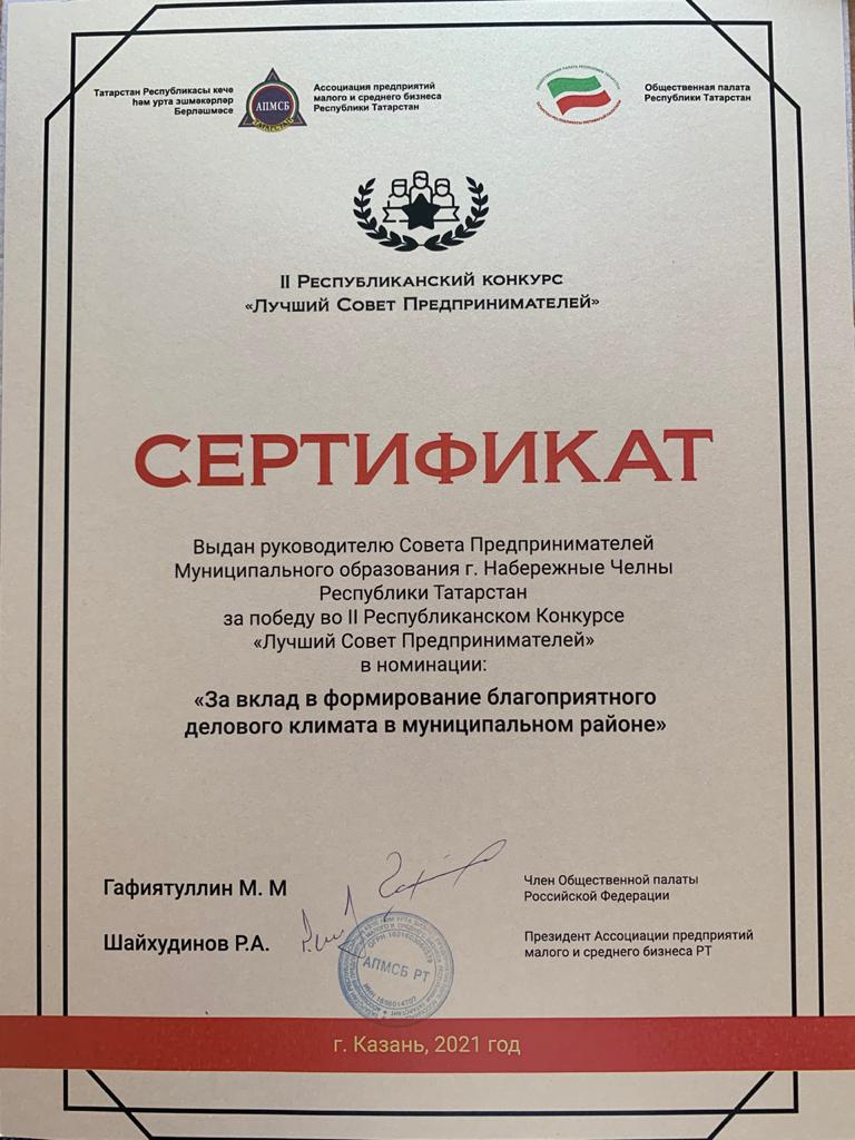 В преддверии празднования Дня российского предпринимательства были подведены итоги II республиканского конкурса «Лучший Совет Предпринимателей». Совет по предпринимательству города Набережные Челны стал лучшим в номинации «За вклад в формирование благоприятного делового климата в муниципальном районе».