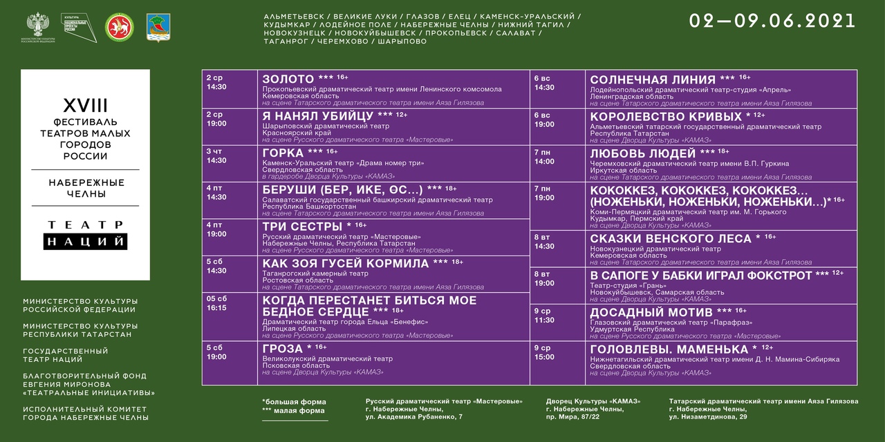 16 творческих коллективов из Пермского и Красноярского краев; Ленинградской, Псковской, Свердловской, Кемеровской, Самарской, Ростовской, Иркутской и Липецкой областей, а также Татарстана, Удмуртии и Башкортостана соберутся в Набережных Челнах, чтобы показать свои лучшие работы. Спектакли будут проходить на сцене театра «Мастеровые», Татарского драматического театра им А.Гилязова и Дворца культуры «КАМАЗ».