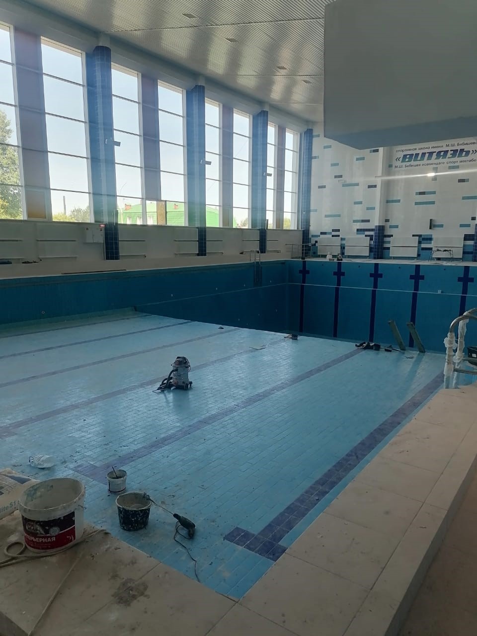 Строители выложили плиткой дно плавательного бассейна «Дулкын», сейчас идет затирка швов.