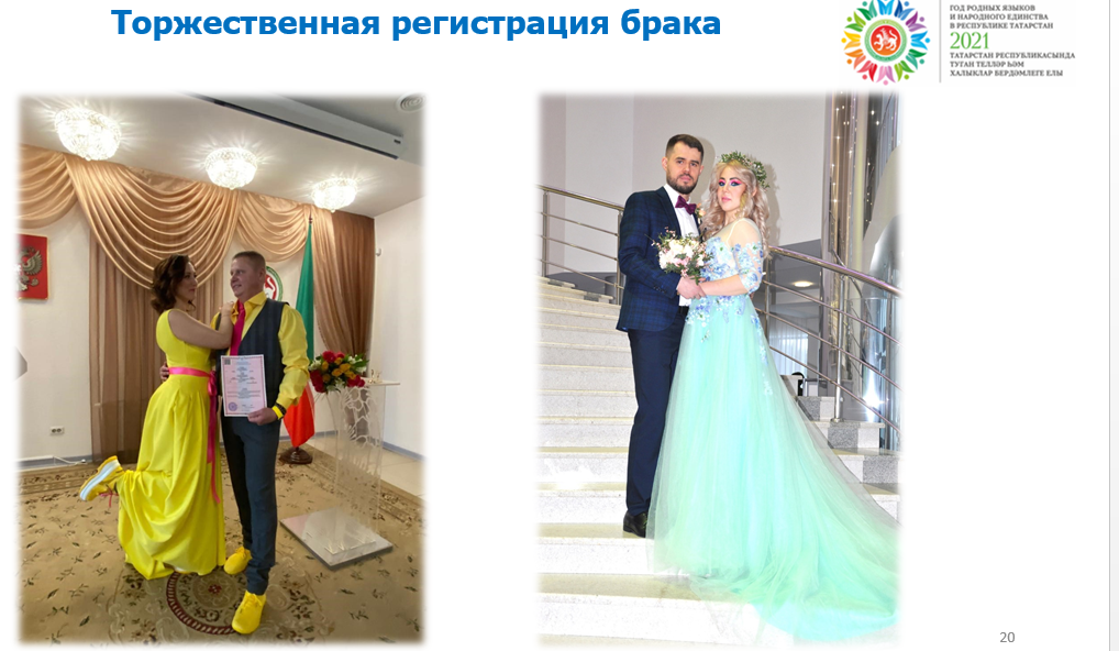 Возрастным рекордом первого полугодия этого года стала регистрация брака 88-летнего мужчины. Самой возрастной невестой стала 74-х летняя дама. Самыми популярными датами для заключения брачных союзов стали 21.01.21, 12.02.21, 17.07.21. На 21.08.21  ожидается регистрация 65 пар.