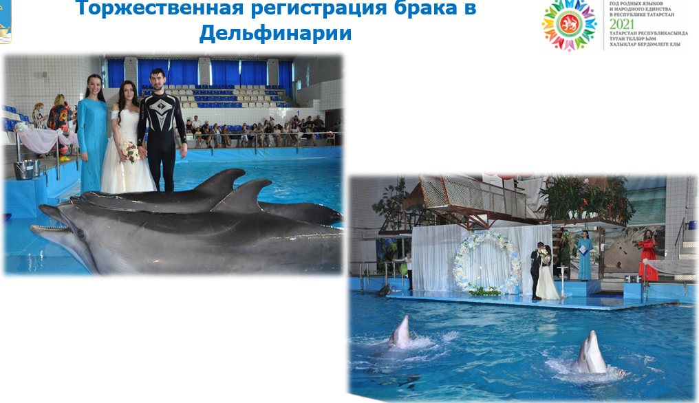 Состоялась выездная регистрация брака в Дельфинарии, где жених приплыл на место торжества со своими друзьями – дельфинами.