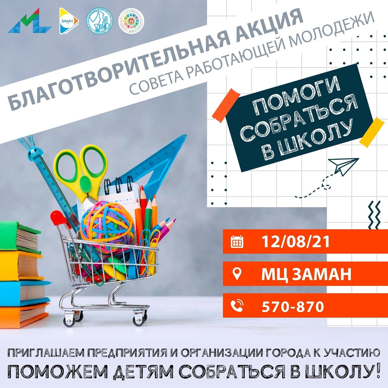 В четверг, 12 августа, в 16:30 на территории молодежного центра «Заман» состоится праздничное мероприятие с вручением канцелярских товаров школьникам в рамках ежегодной акции «Помоги собраться в школу».