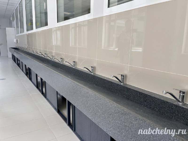 Перед входом в столовую установлены раковины необычной формы – лотковые – из искусственного гранита.