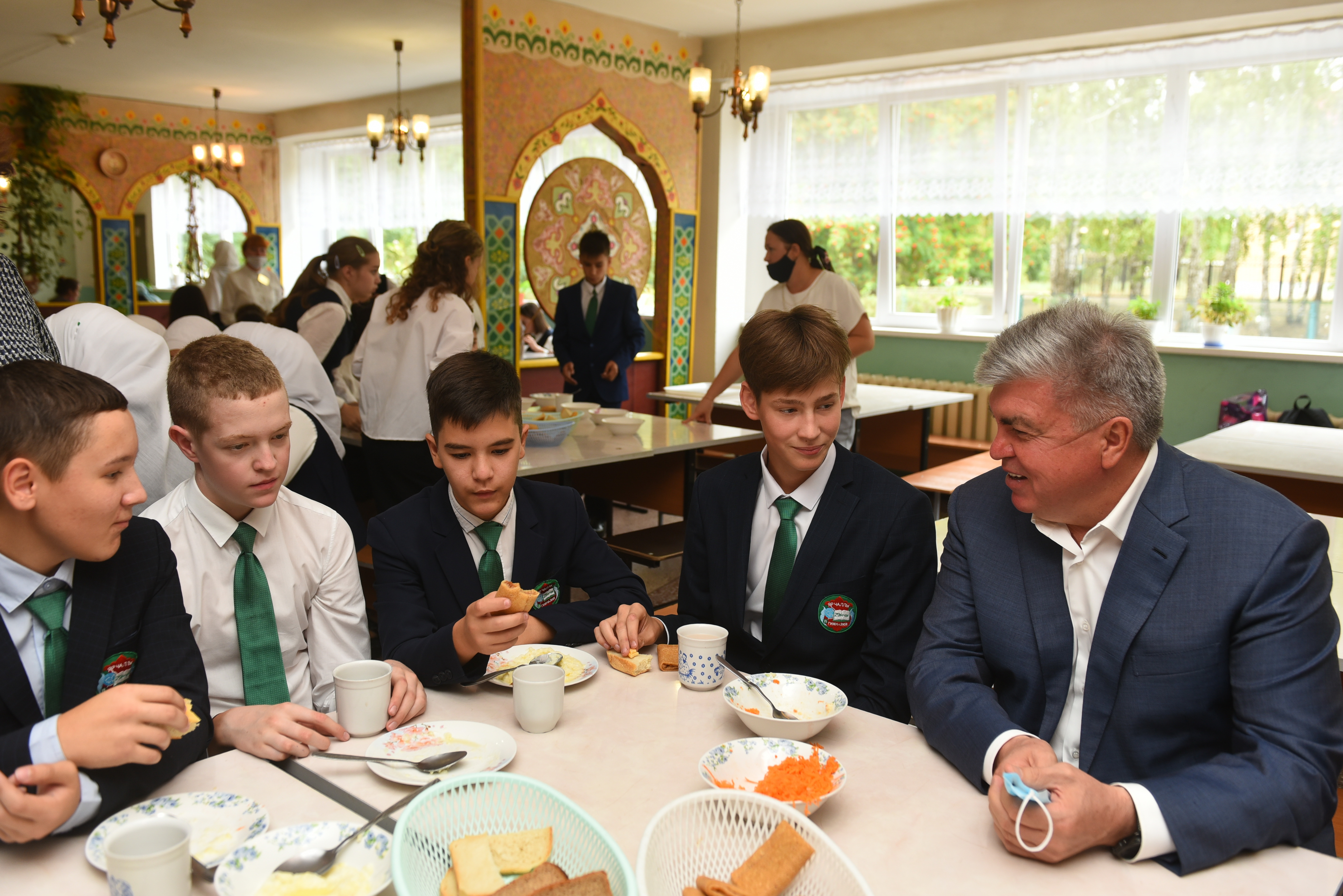 Сегодня мэр города Наиль Магдеев посетил татарскую гимназию, чтобы проверить старт учебного процесса и организацию школьного питания.