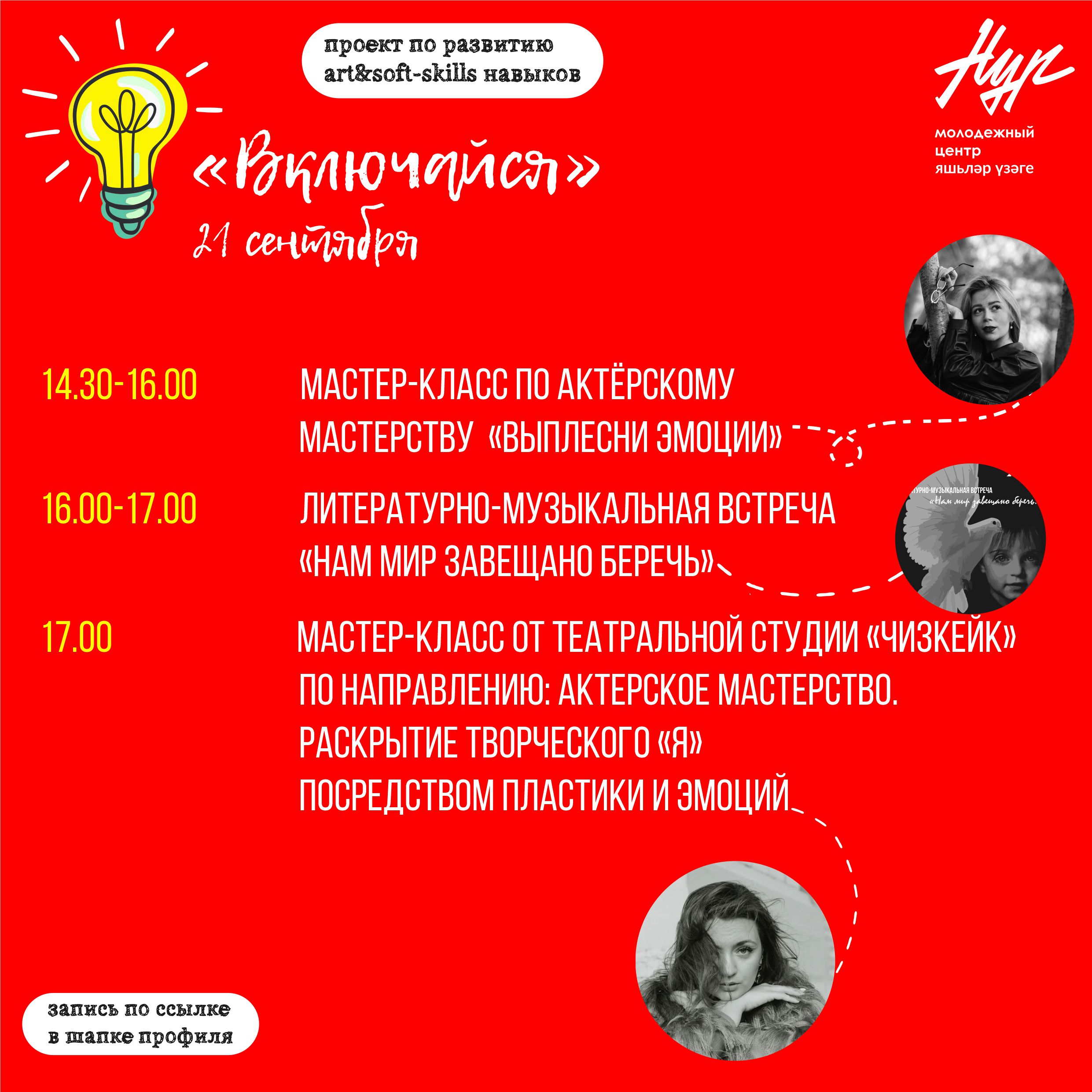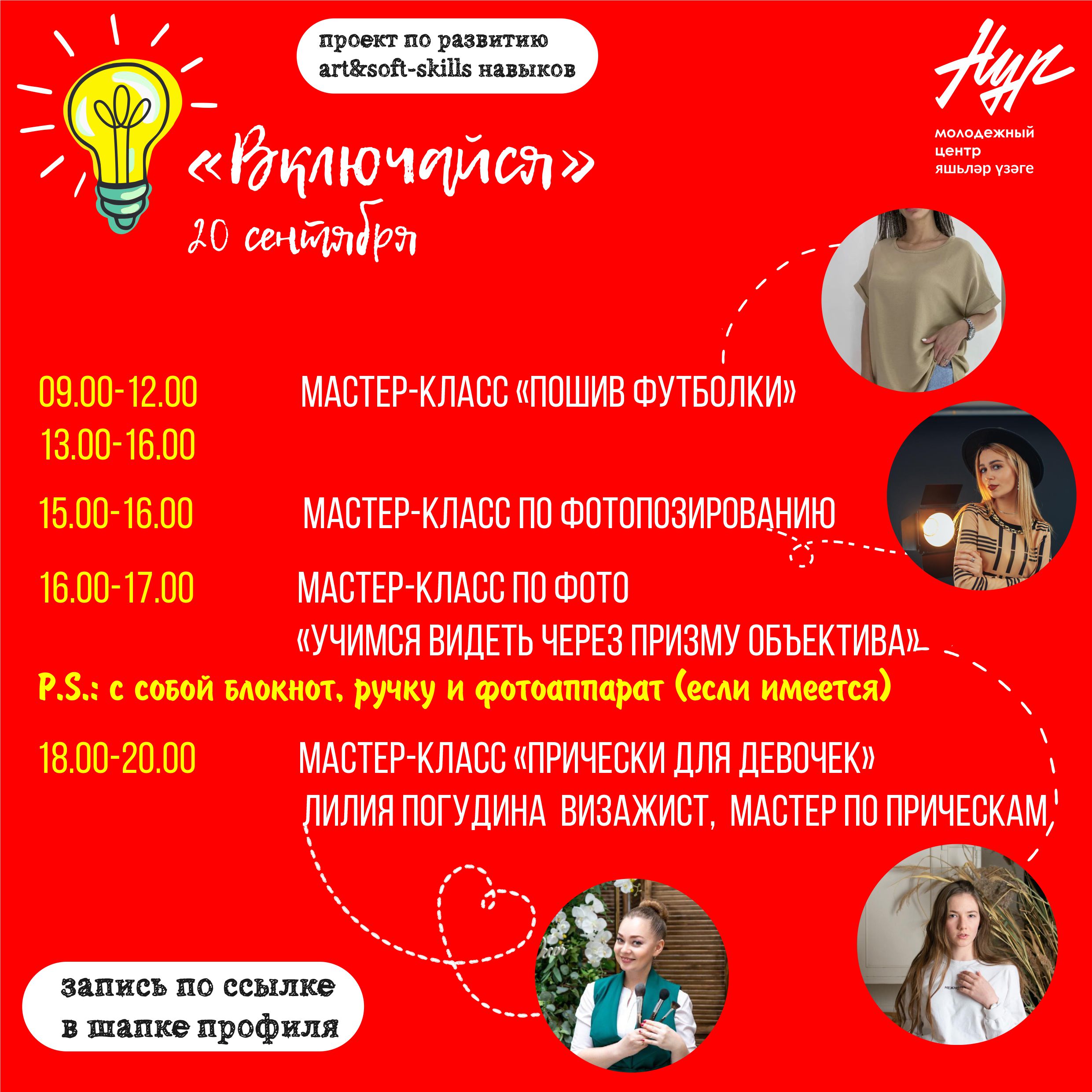 Молодежный центр «Нур» проводит бесплатные мастер-классы и встречи по развитию art&soft-skills. Мероприятия пройдут до 25 сентября.