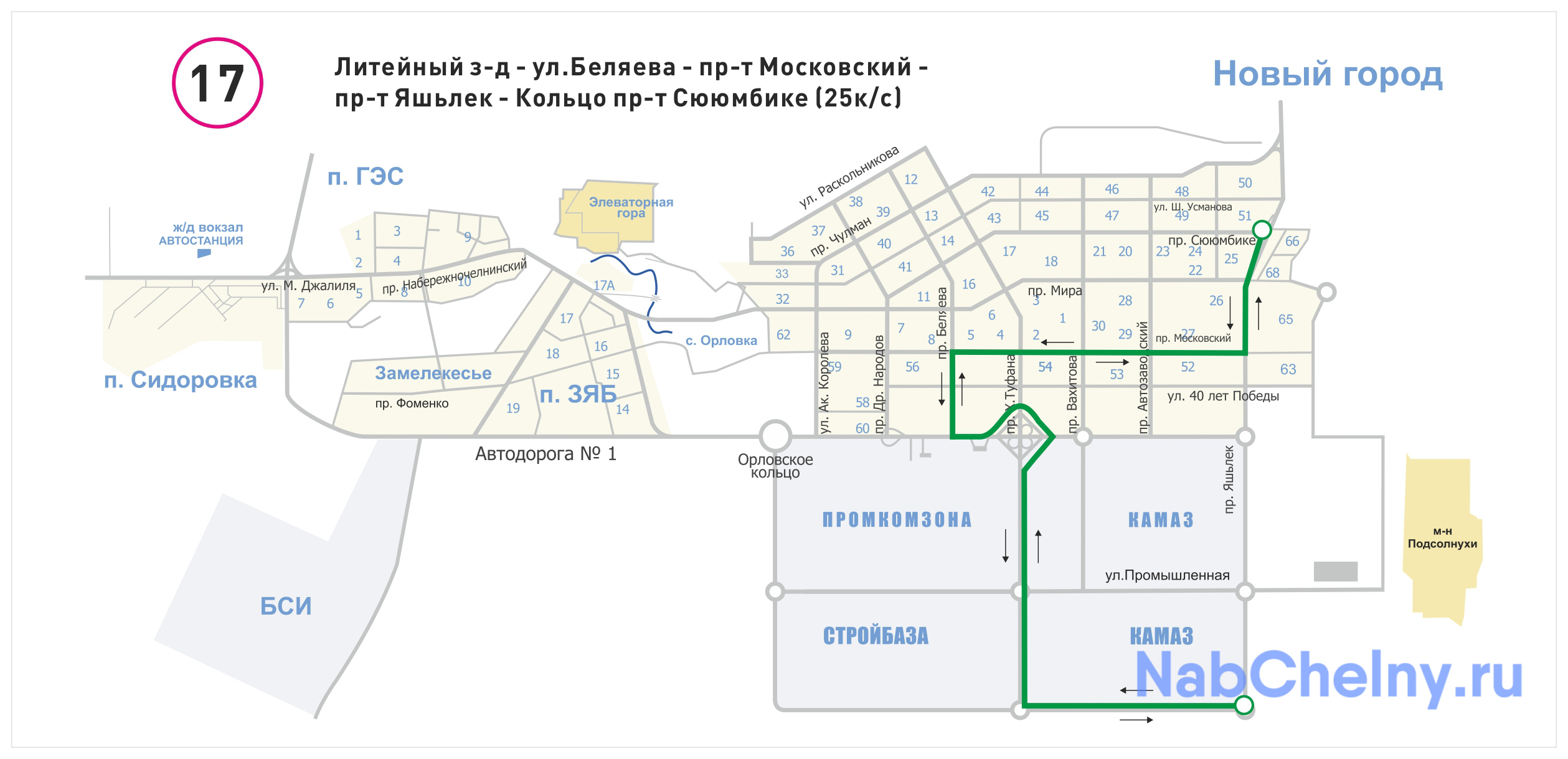 Маршрут № 17: «Литейный завод – ул. Раиса Беляева – пр. Московский – пр. Яшьлек – кольцо пр. Сююмбике (25 комплекс)».