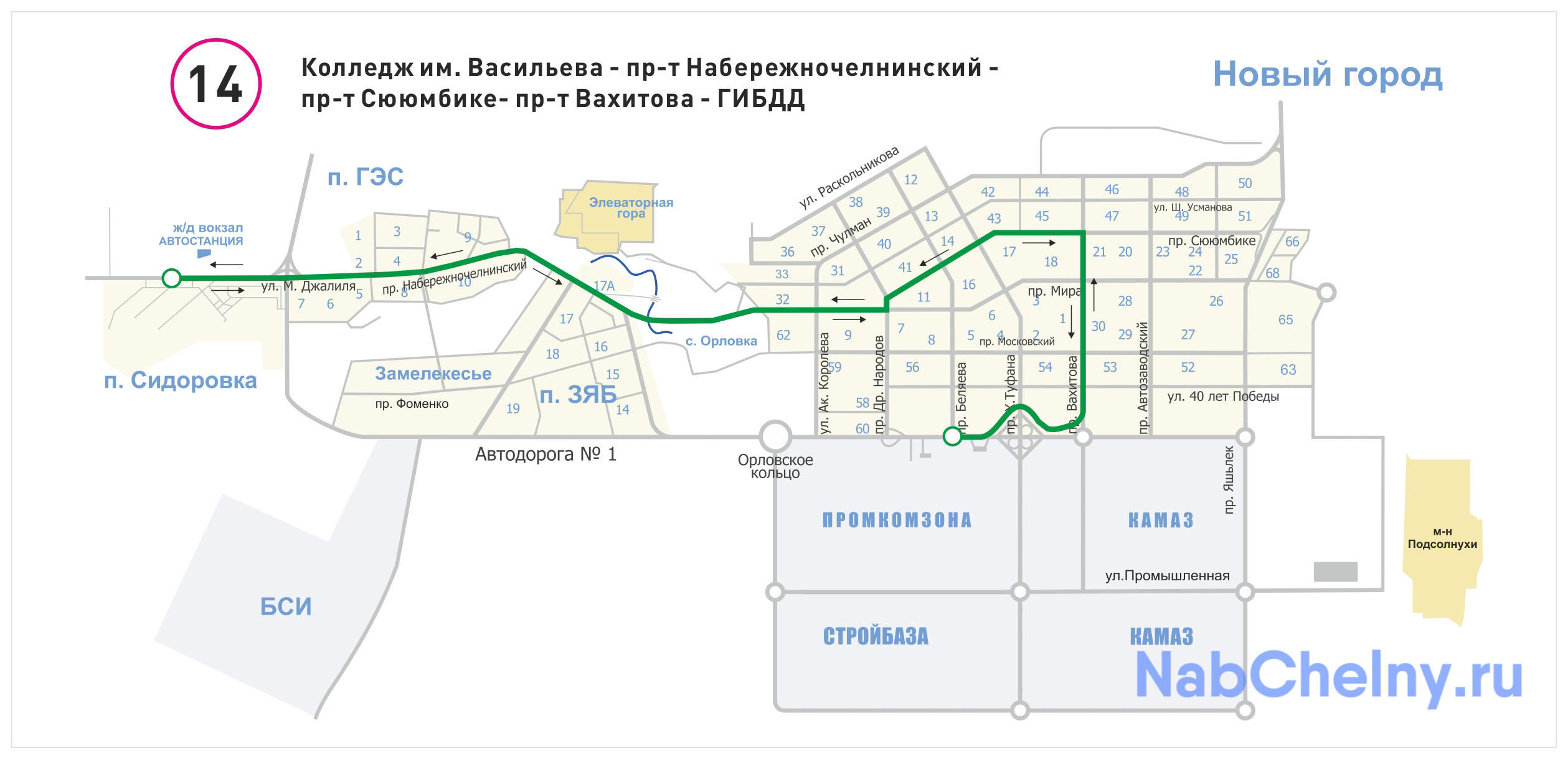 Маршрут № 14: «п. Сидоровка – пр. Набережночелнинский – пр. Сююмбике – пр. Вахитова – ост. «Управление ГИБДД».