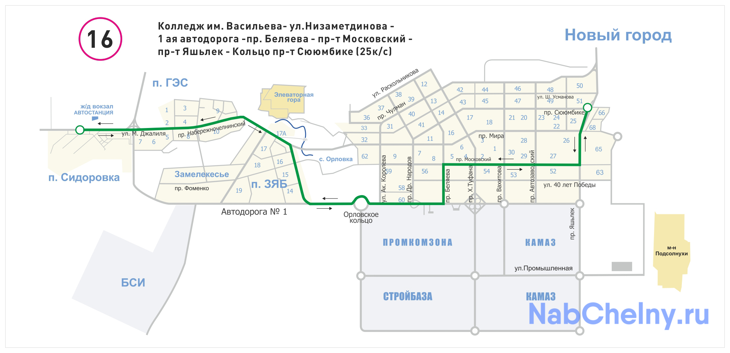 Маршрут № 16: «п. Сидоровка – ул. Низаметдинова – 1-я а/дорога – ул. Раиса Беляева – пр. Московский – пр. Яшьлек – кольцо пр. Сююмбике (25 комплекс)».