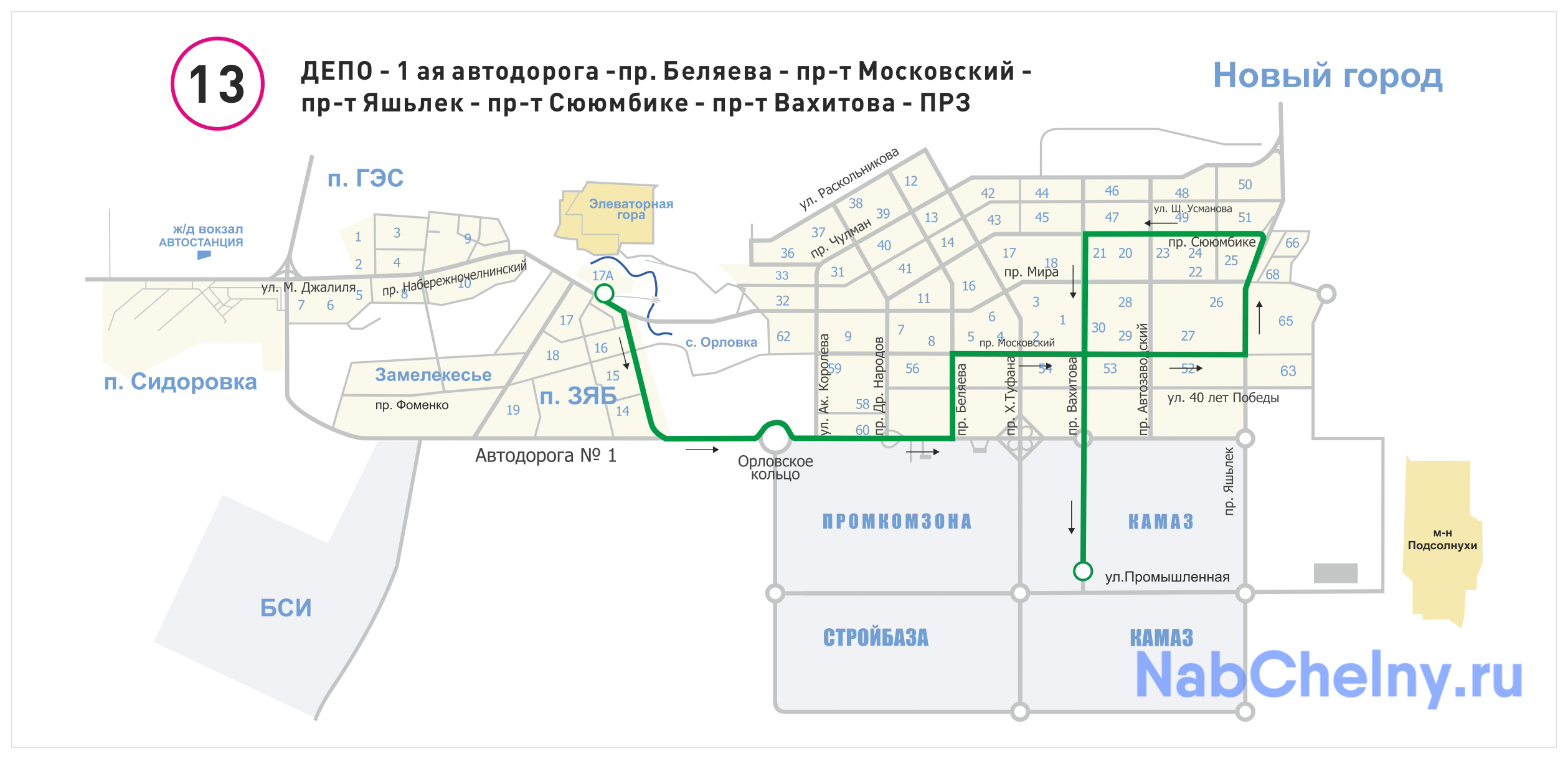 Маршрут № 13: «Депо – ул. Низаметдинова – 1-я а/дорога – ул. Раиса Беляева – пр. Московский – пр. Яшьлек – пр. Сююмбике – пр. Вахитова – Прессово-рамный завод».