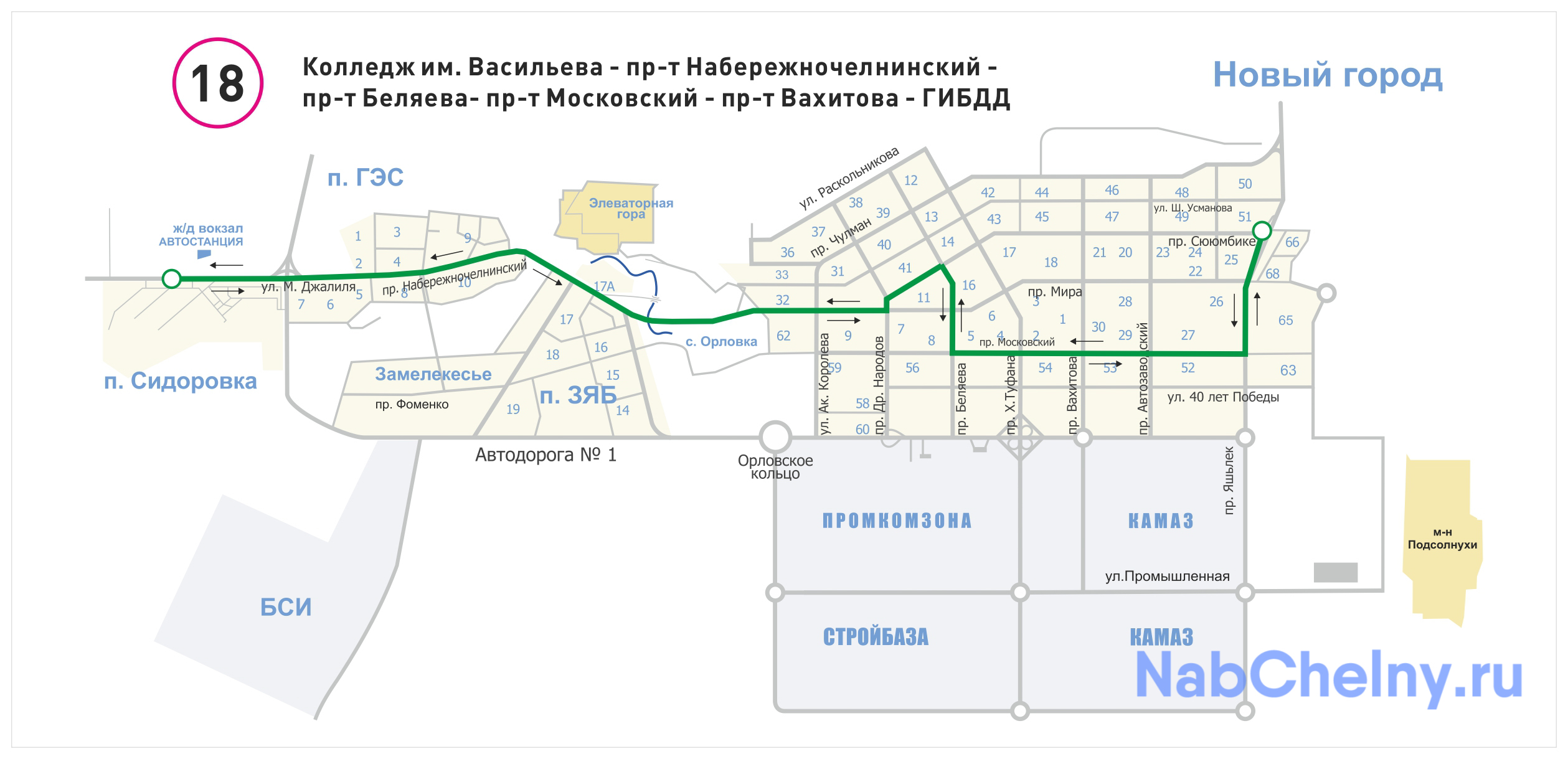 Маршрут № 18: «п. Сидоровка – пр. Набережночелнинский – ул. Раиса Беляева – пр. Московский – пр. Яшьлек – кольцо пр. Сююмбике (25 комплекс)».
