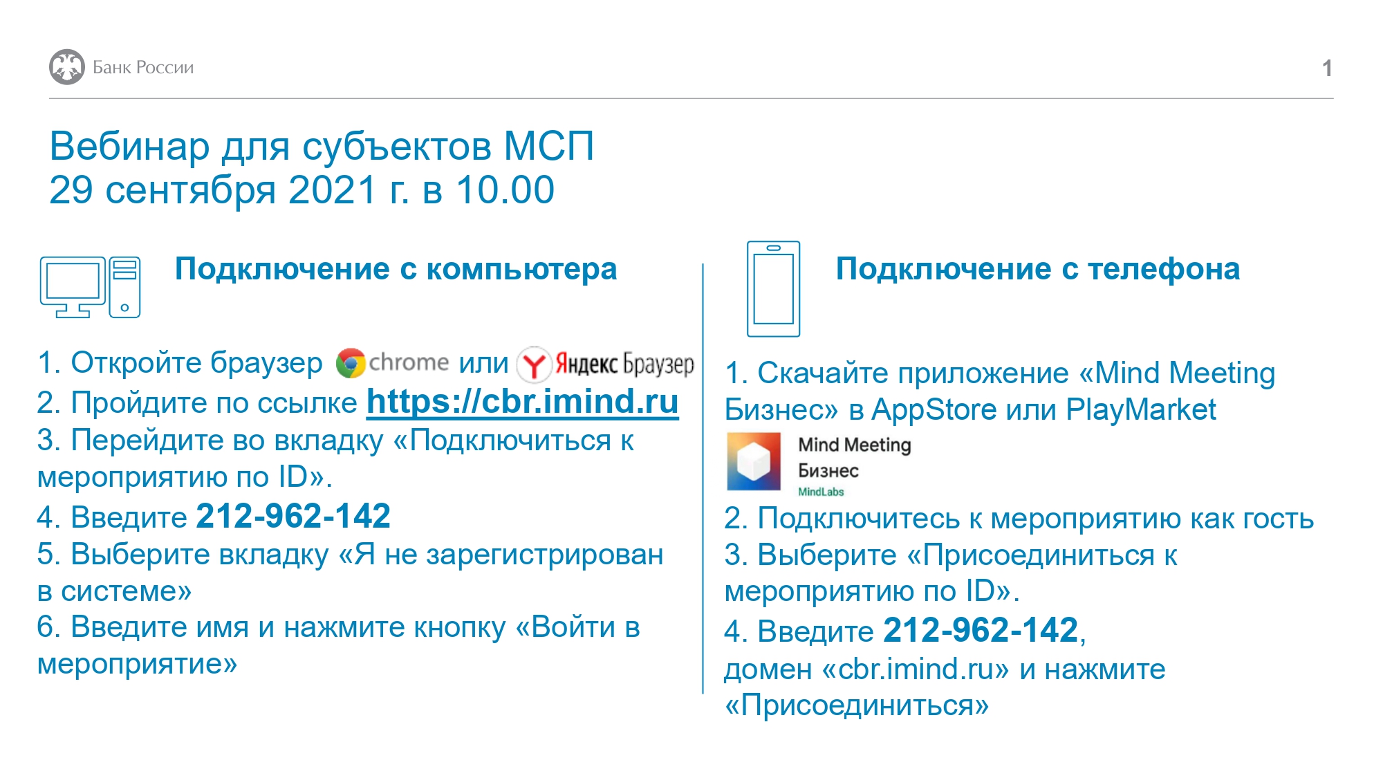 Сегодня, 29 сентября, в 10:00 при участии Центрального банка РФ состоится вебинар на тему "Возможности привлечения финансирования для субъектов МСП".