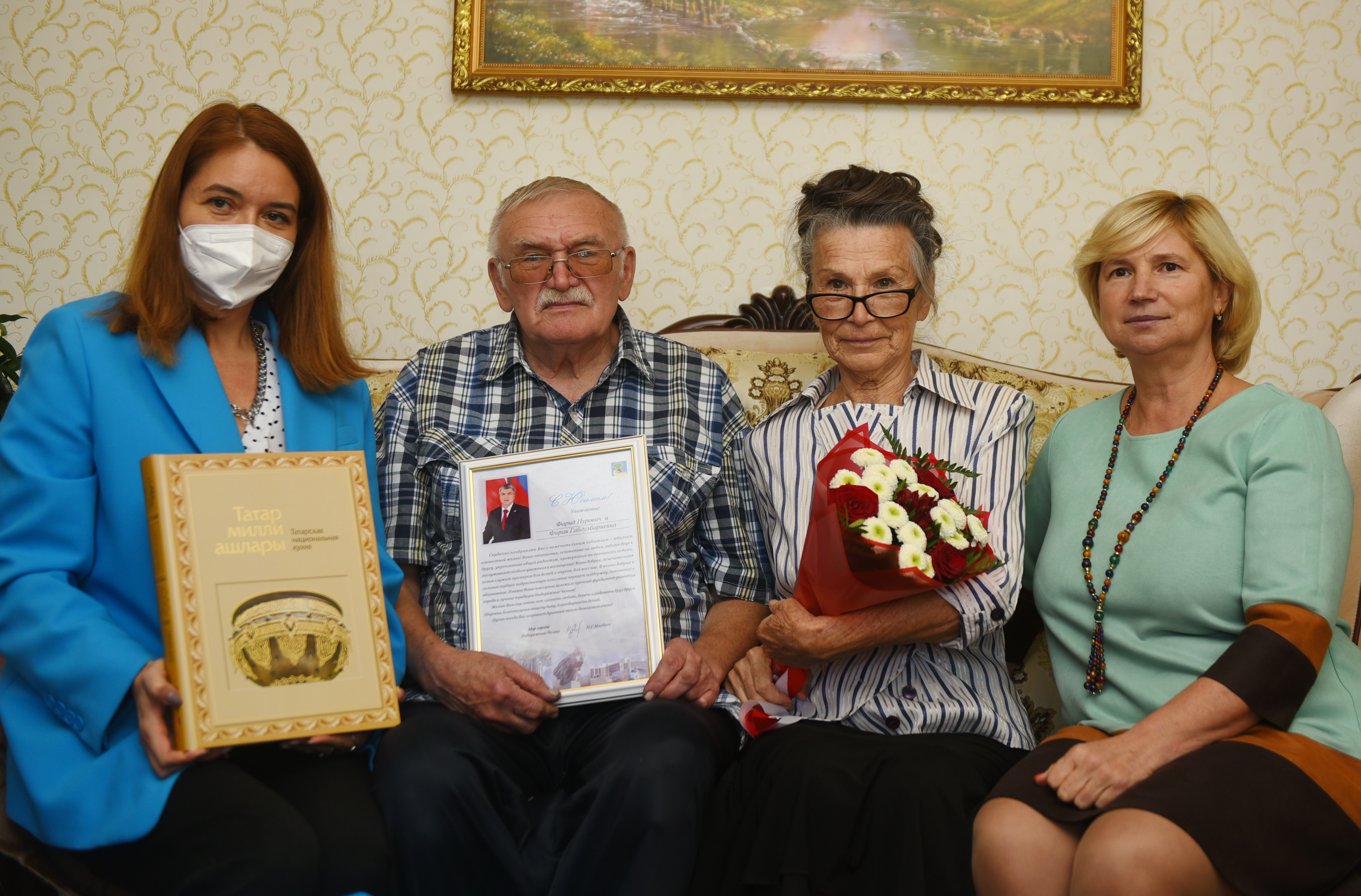 Поздравить Фарида Нуровича и Фираю Бариевну с семейным юбилеем пришли заместитель начальника управления ЗАГС Диана Гафурова и замглавы Автозаводского района Елена Альмухаметова, которые вручили Поздравительный адрес от имени мэра Набережных Челнов и памятные подарки.