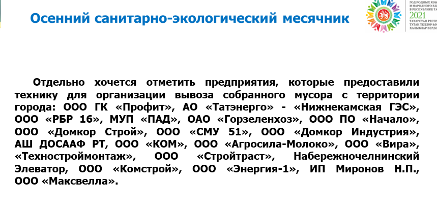 В рамках экологического мероприятия проведены 3 средника и 4 субботника, в том числе: 16 октября - общегородской субботник, 11 сентября – Всероссийская акция «Вода России», с 4 по 10 октября – природоохранная акция «Сохраним лес» и др. Об этом рассказал первый заместитель руководителя Исполнительного комитета Илья Зуев.