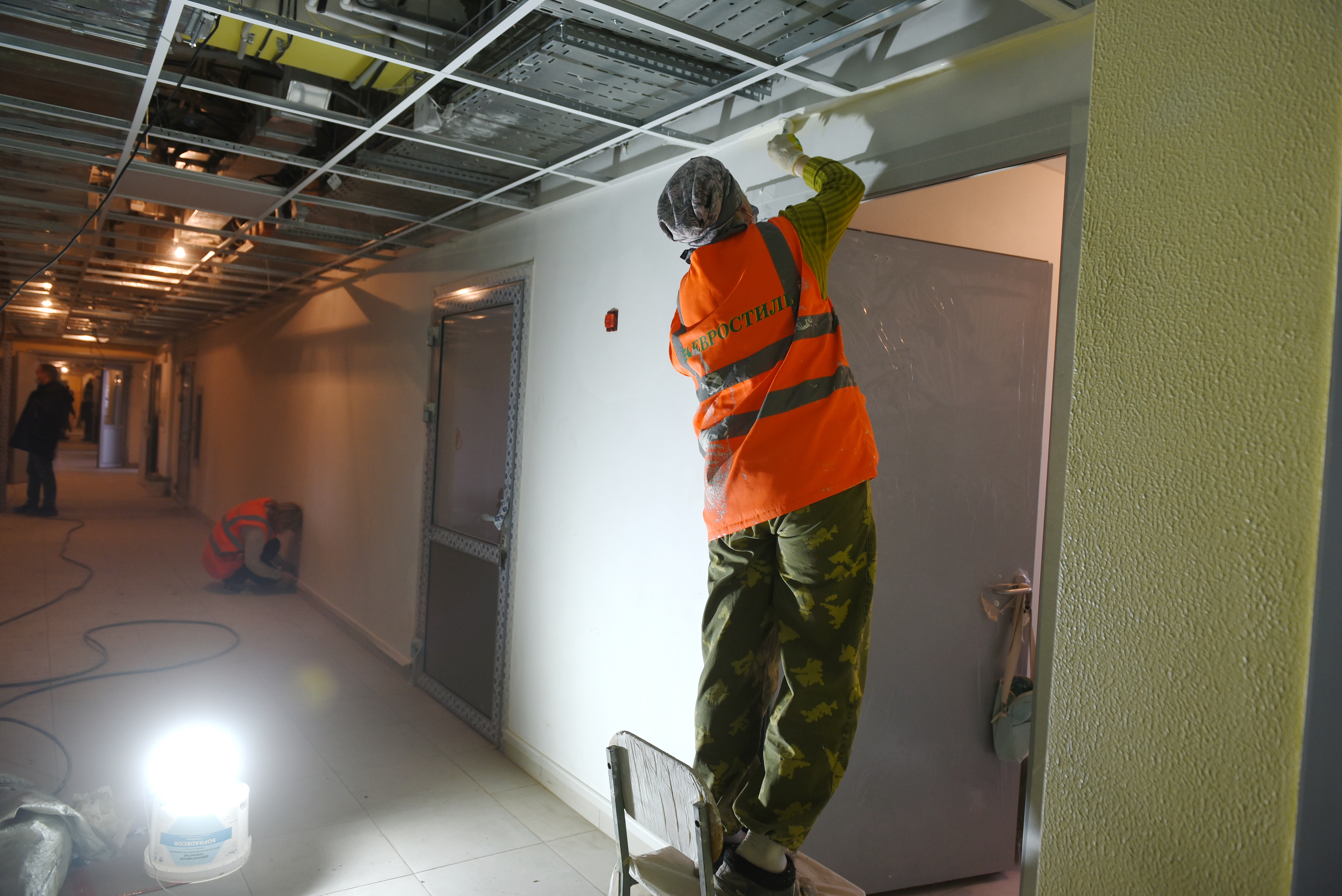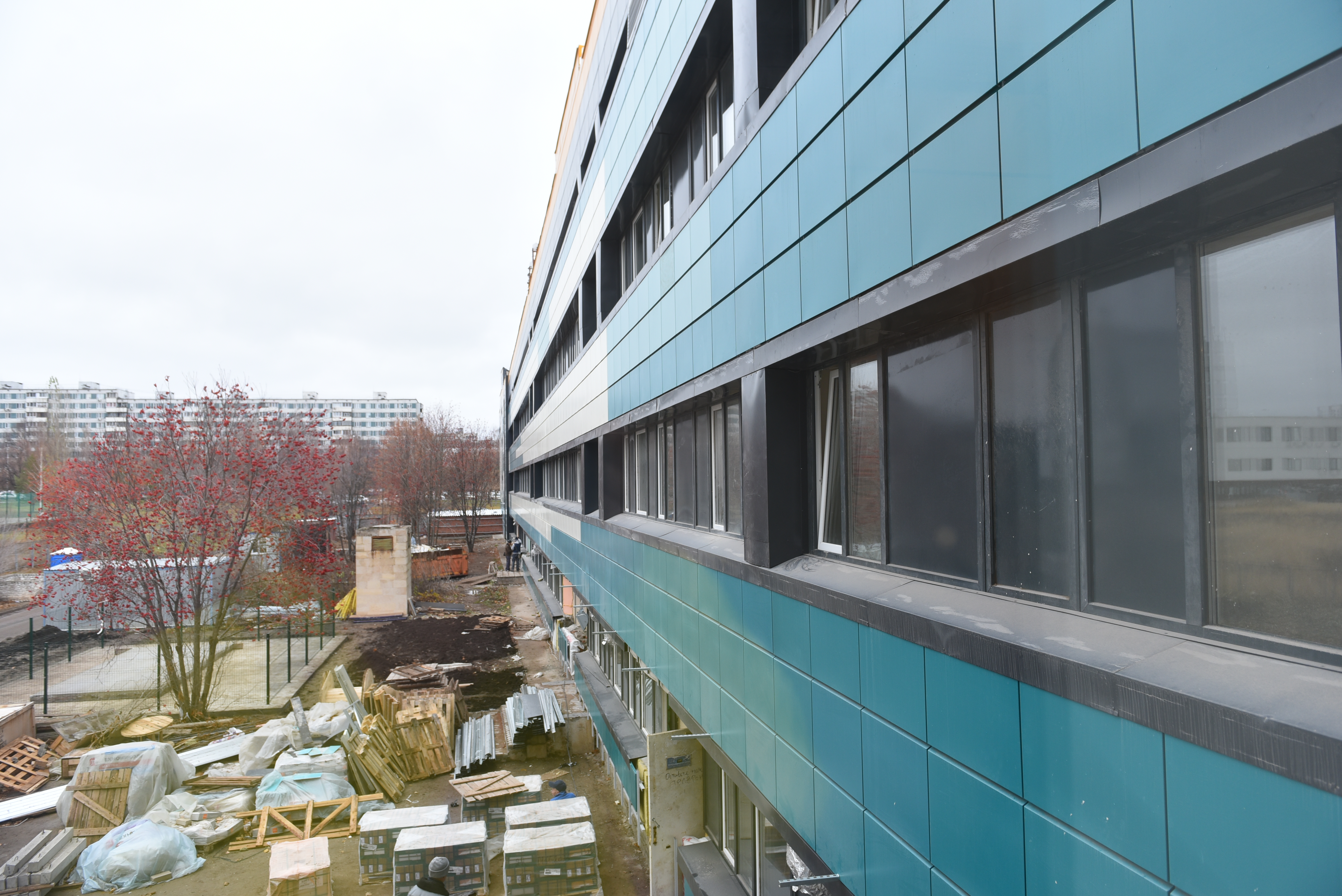 Сейчас строители завершают работы в блоке Б. Выполняется устройство фасада, отделочные работы, устройство внутренних инженерных сетей, монтаж системы медицинского кислородоснабжения и вакуума. Процент выполнения очень большой – 85%, планируется, что к концу года объект будет завершен.
