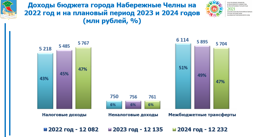 Она сообщила, что прогнозируемый общий объем доходов бюджета города Набережные Челны в 2022 году запланирован в сумме 12 млрд 82 млн рублей, в плановом 2023 году – 12 млрд 135 млн рублей и в 2024 году – 12 млрд 232 млн рублей. Плановые показатели на 2022 год приняты с ростом к плановым назначениям 2021 года на 14%. Собственные доходы бюджета спрогнозированы с ежегодным ростом 4,6% на ближайшие три года.