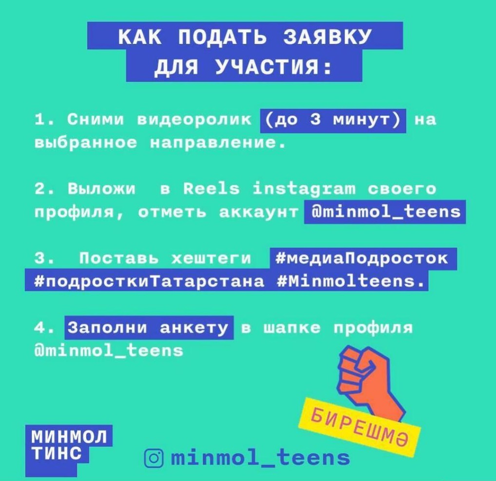 Министерство по делам молодежи Республики Татарстан запустило конкурс медиаконтента для подростков 12-18 лет. Заявиться на конкурс видеороликов "Тик-ток Teens" молодые челнинцы могут самостоятельно, а также в составе творческих групп до пяти человек.