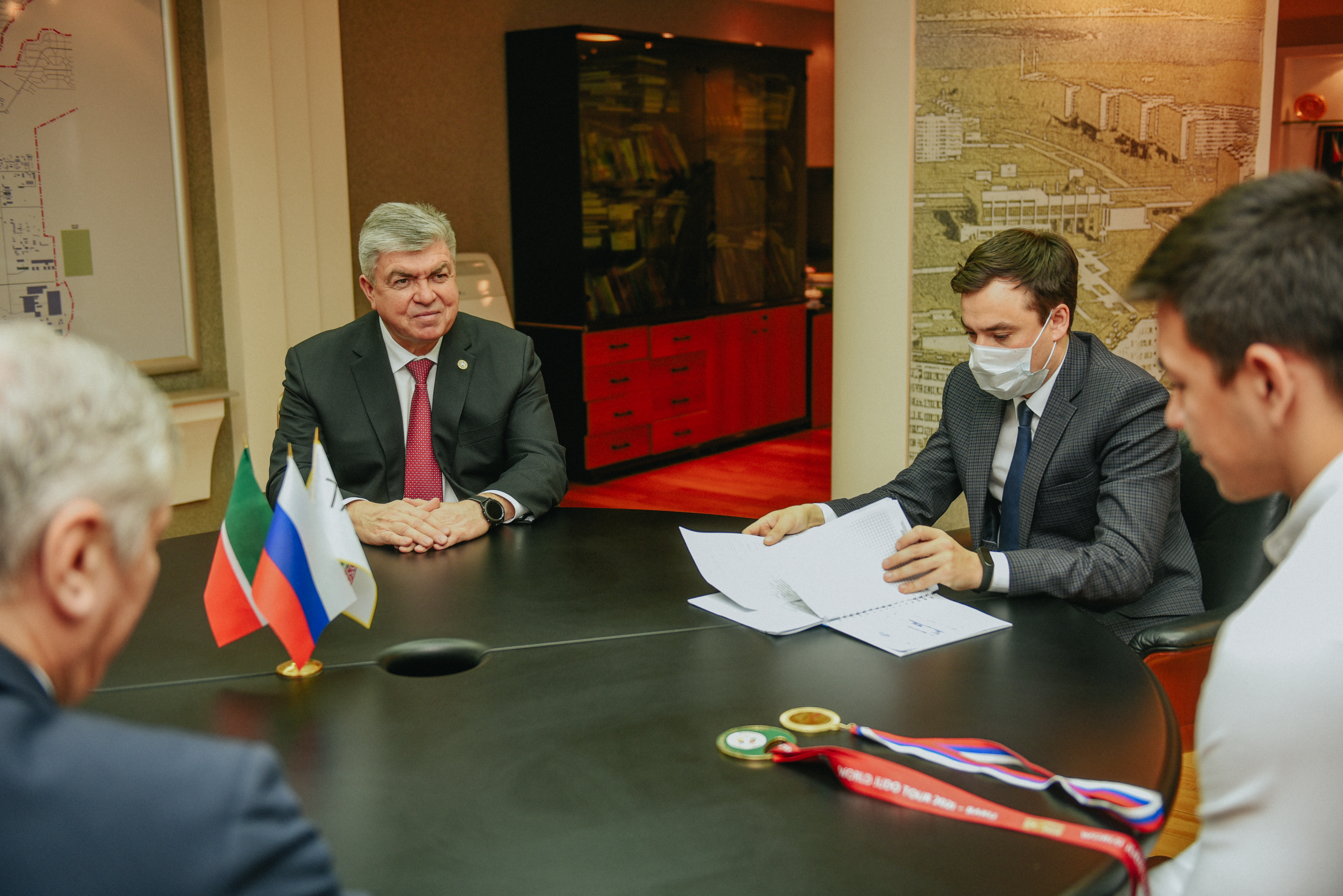 На встрече с мэром также присутствовали начальник управления физической культуры и спорта Роман Насрединов, директор спортивной школы "Олимпийский" Рамиль Касимов, старший тренер отделения дзюдо Константин Толмачев.