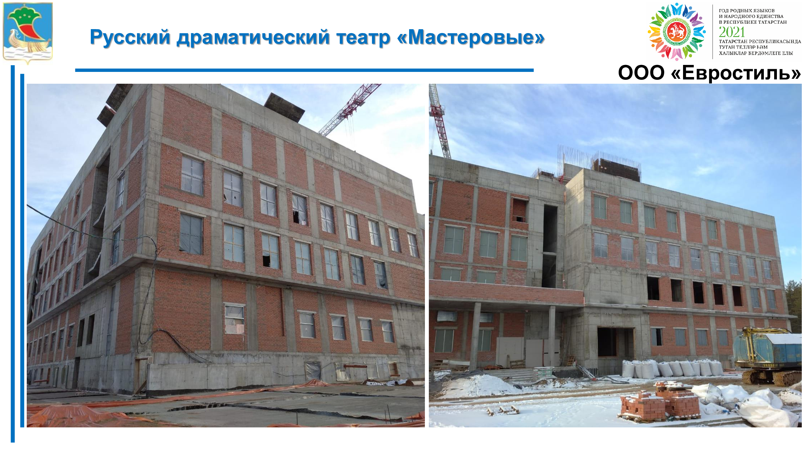 Готовность здания русского драматического театра "Мастеровые" составляет 46%. Возводит объект челнинская компания «Евростиль» под руководством Ильнара Гайсина. На строительной площадке работают 170 человек. Сейчас на объекте ведется кирпичная кладка перегородок, отделочные работы, устройство наружных и внутренних инженерных сетей.