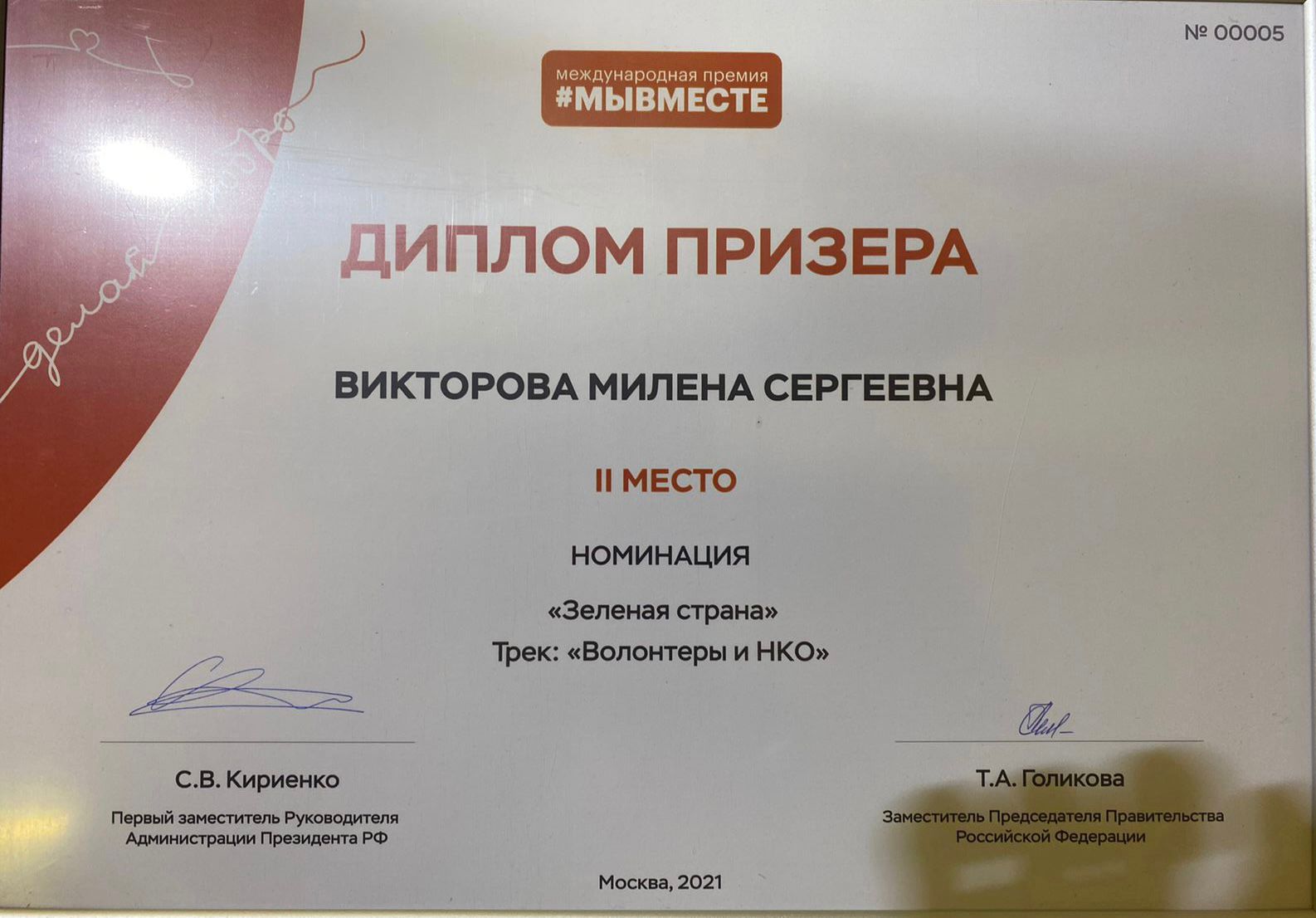 Милена Викторова – спикер детской общественной организации «Городской совет учащихся» заняла 2 место в номинации «Зеленая страна» международной премии #МыВместе.