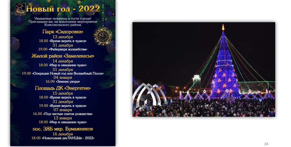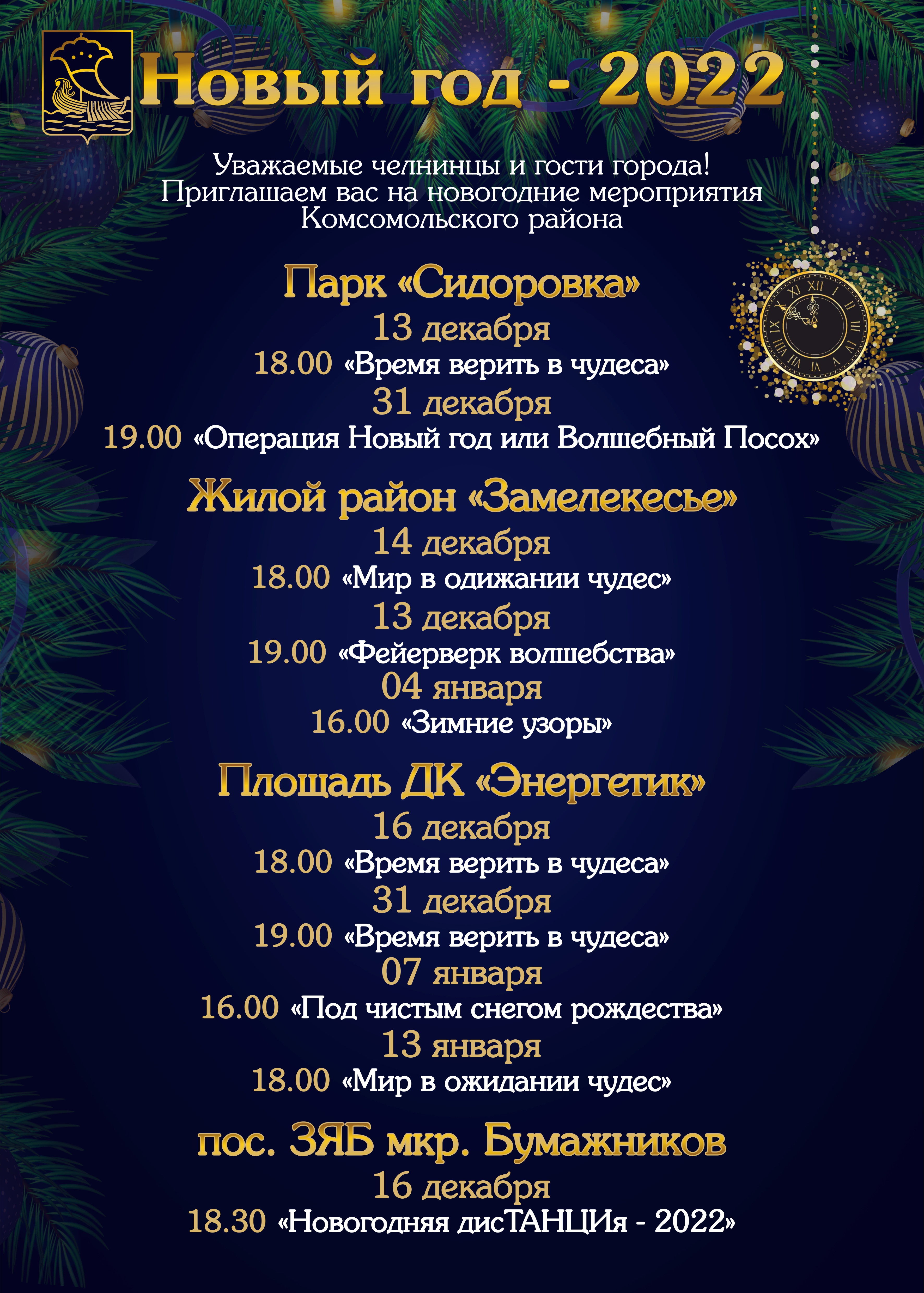 14 декабря в 18:00 зажгутся огни на новогодних елках в микрорайоне Замелекесье и во дворе дома 38/13. На площади перед ДК «Энергетик» 15 декабря в 18:00 начнется праздничное мероприятие.  16 декабря в 16:00 главный символ предстоящего праздника зажжется новогодними огнями в микрорайоне Бумажников и на бульваре Шишкинский.
