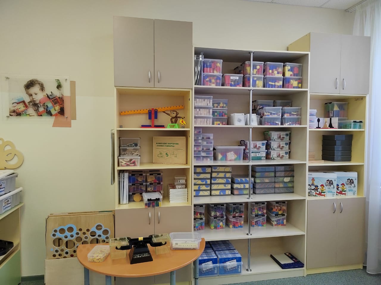 Кабинет для занятий оборудован современными пособиями и материалами для работы воспитанников и педагогов: интерактивной доской, проектором, ноутбуками, 3D-ручками, роботами, различными конструкторами и т.д.