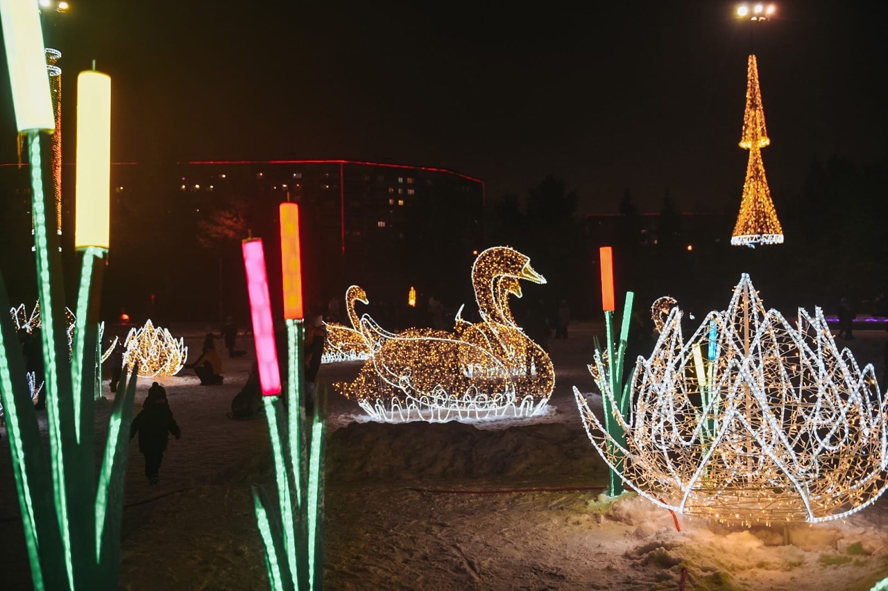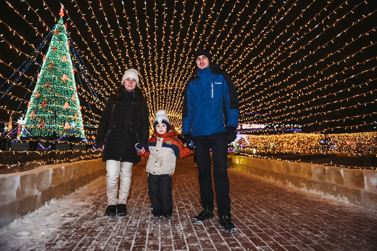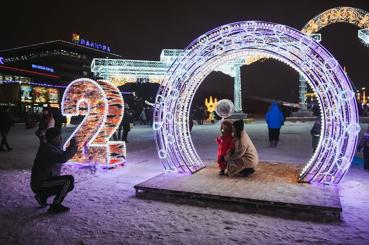 Вся площадь засияла огнями, музыкой. Подсветка в виде конфет и хлопушек появилась на столбах освещения, на деревьях раскинулись цветные огни.
