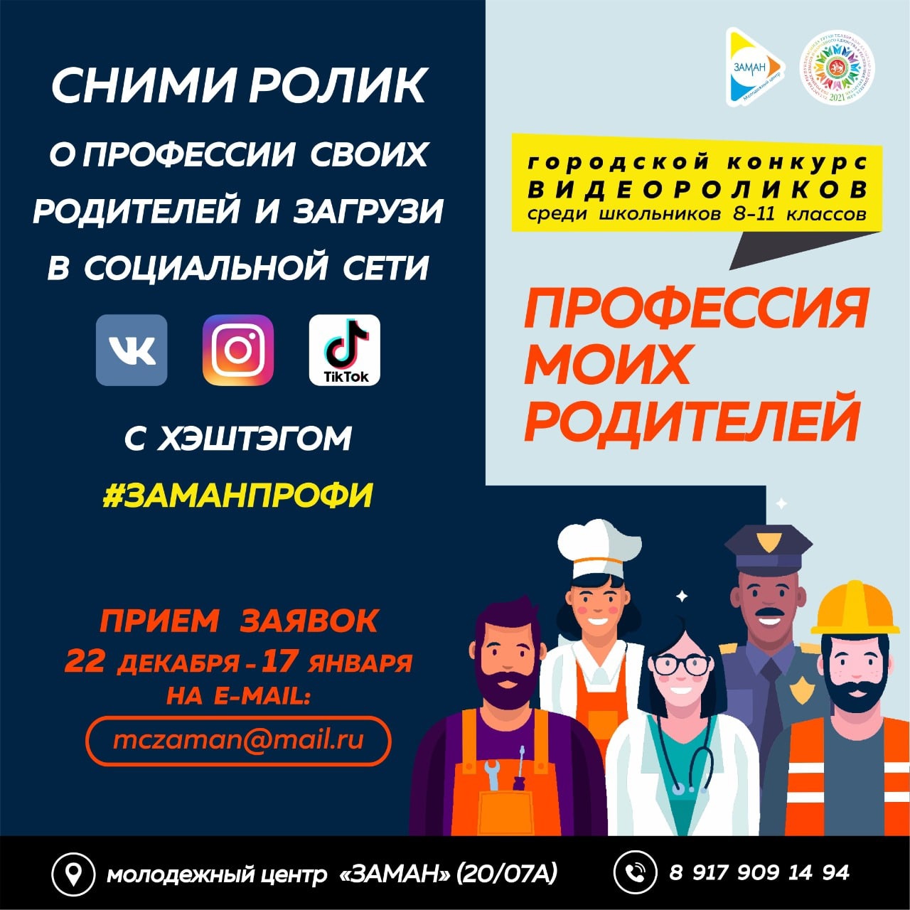 Челнинские школьники могут заявиться на конкурс видеороликов «Профессия моих родителей». Участниками могут стать учащиеся 8-11 классов. Для этого необходимо с 22 декабря по 17 января 2022 года снять видеоролик о профессии родителей и выложить в социальной сети VKontakte, Tik Tok или Instagram с хэштэгом #ЗаманПрофи.