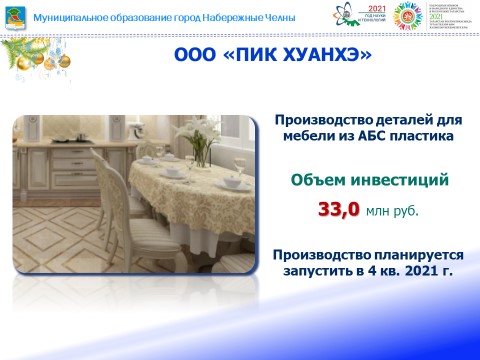В ноябре текущего года зарегистрирован новый резидент ТОСЭР «Набережные Челны» – компания ПИК «ХУАНХЭ» с инвестиционным проектом по производству деталей для мебели из АБС пластика.