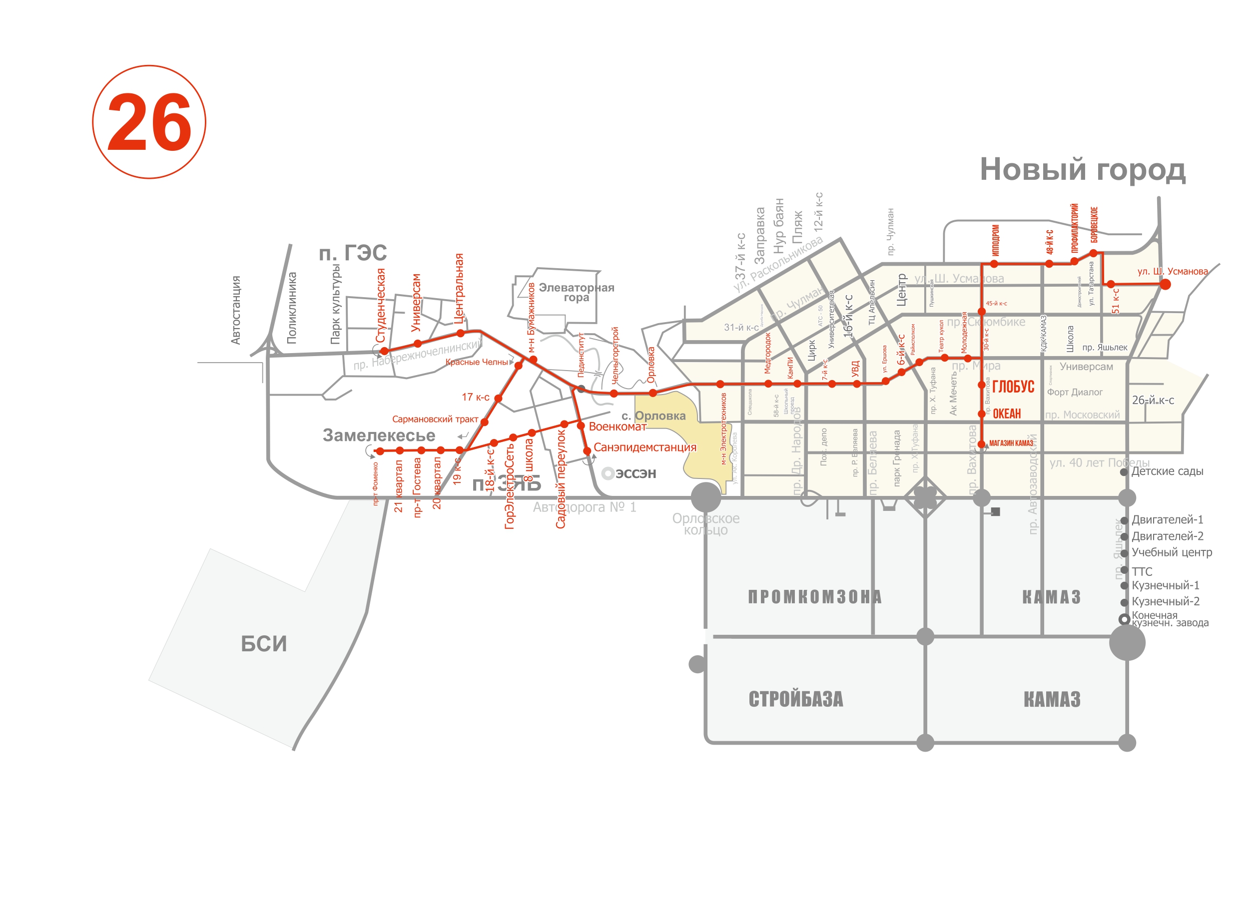 Движение автобусов маршрута №26 с пос. ГЭС будет осуществляться через остановки «Студенческая», «Универсам», «Центральная», далее автобус продолжает движение по Сармановскому тракту, через остановки «Красные Челны», «17 комплекс»,  с выездом на проспект Фоменко. Далее без изменений по маршруту.