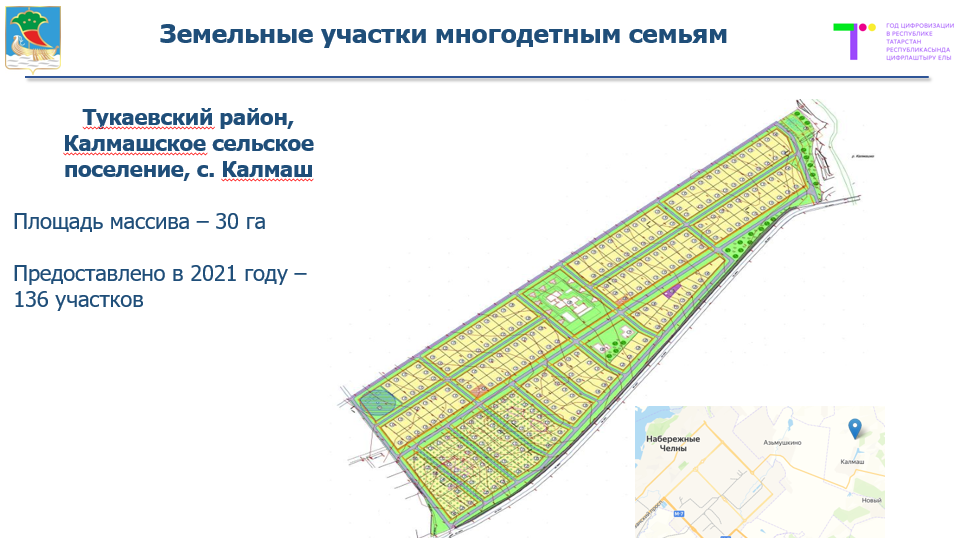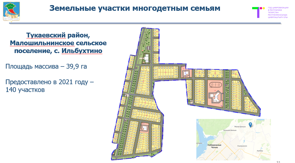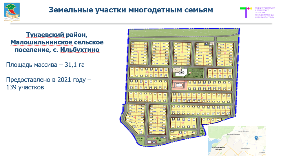 2021 елда Тукай муниципаль районының Ильбухтино авылында һәм Калмаш авылында урнашкан 415 җир кишәрлеге бирелгән. Күп балалы гаиләләрне җир кишәрлекләре белән тәэмин итү өчен өстәмә рәвештә 900 гектардан артык җир кирәк.