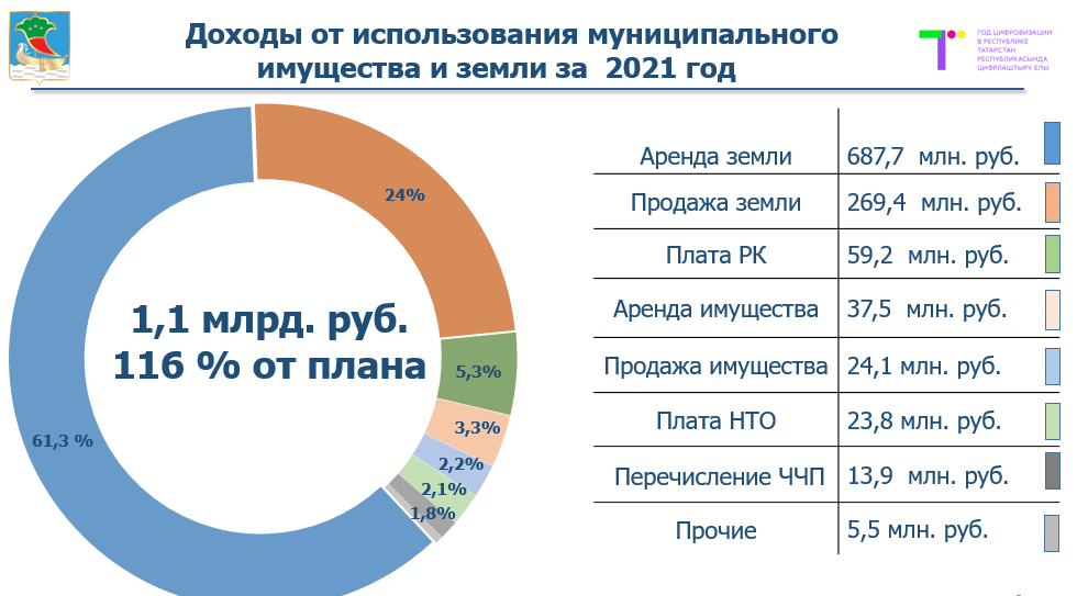 В результате деятельности управления земельных и имущественных отношений города Набережные Челны в 2021 году в городской бюджет поступил  1 млрд 121 млн руб., что на 338 млн руб. больше по сравнению с 2020 годом. Рост составил 43 %. Плановые показатели перевыполнены на 16 %.
