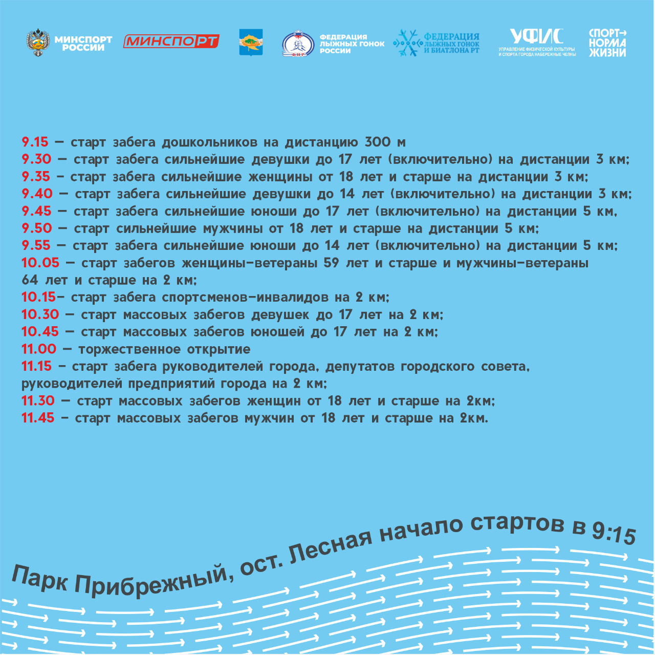 12 февраля в Набережных Челнах пройдет «Лыжня Татарстана - 2022» в рамках соревнований «Лыжня России». Старт для лыжников запланирован на 9:00 в парке Прибрежный. В этот день попробовать свои силы на лыжной трассе смогут дошкольники – им отведена трасса в 300 метров, женщины и мужчины старше 50 лет – для них подготовлена трасса 2 км, а также юноши, девушки, мужчины и женщины на дистанциях в 3 и 5 км.