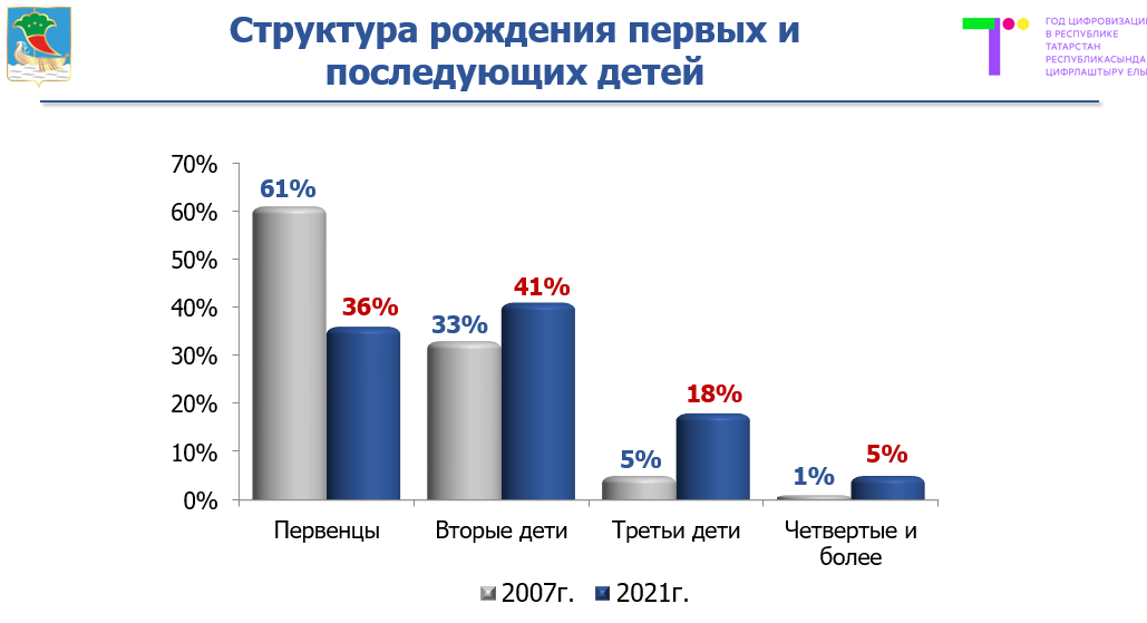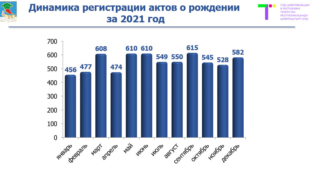 «Как по абсолютному количеству, так и в расчете на тысячу человек населения наш город занимает второе место по зарегистрированным актам о рождении. В автограде этот показатель достигает 12,4, по Республике Татарстан - 10,6, по Российской Федерации – 9,7», - сообщила начальник ЗАГСа Равиля Зарипова.