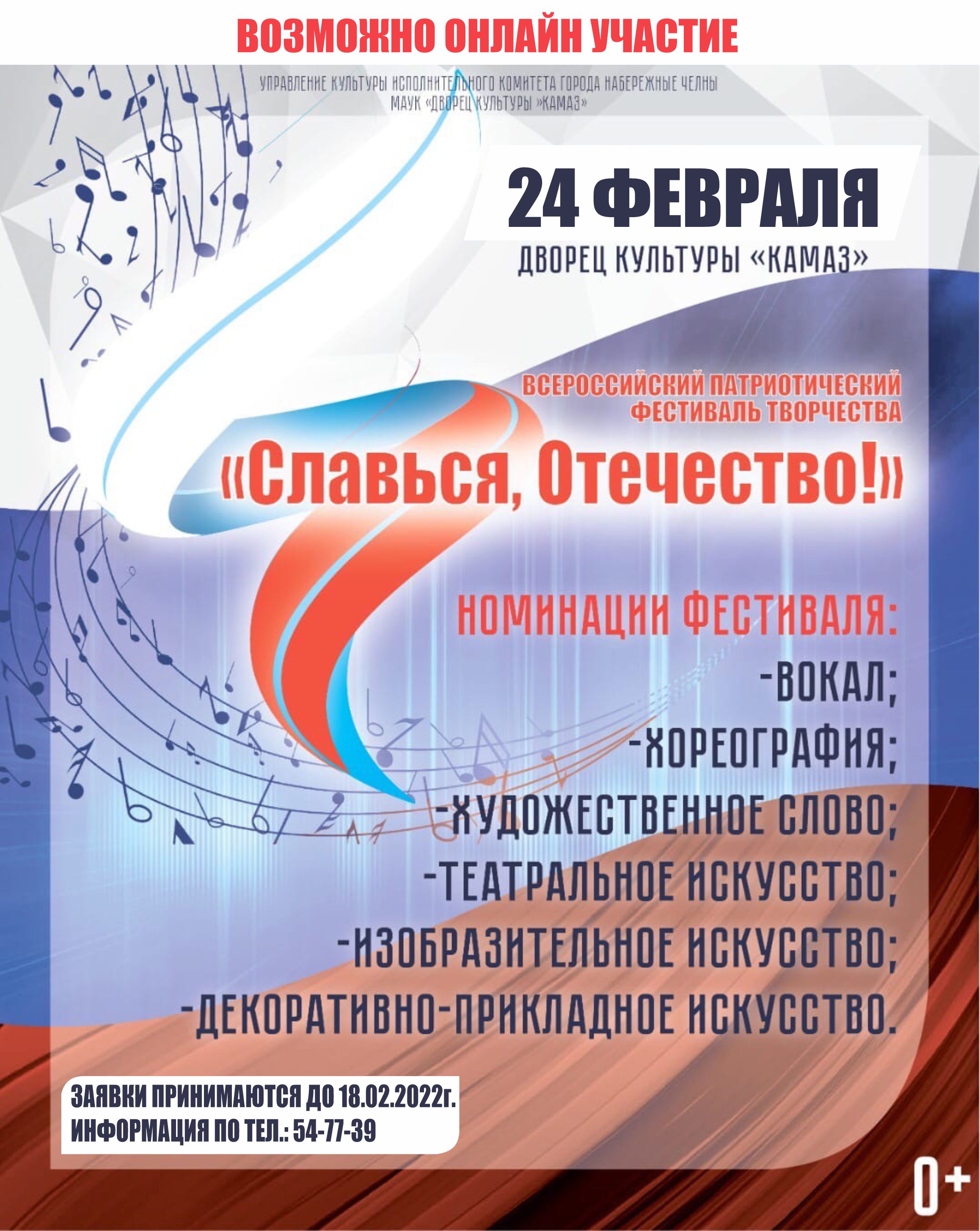 2022 елның 24 февралендә «КАМАЗ» мәдәният сараенда «Славься, Отечество!» Бөтенроссия патриотик иҗат фестивале узачак. Фестивальне Яр Чаллы шәһәре Башкарма комитетының мәдәният идарәсе ярдәмендә «КАМАЗ» мәдәният йорты оештыра.