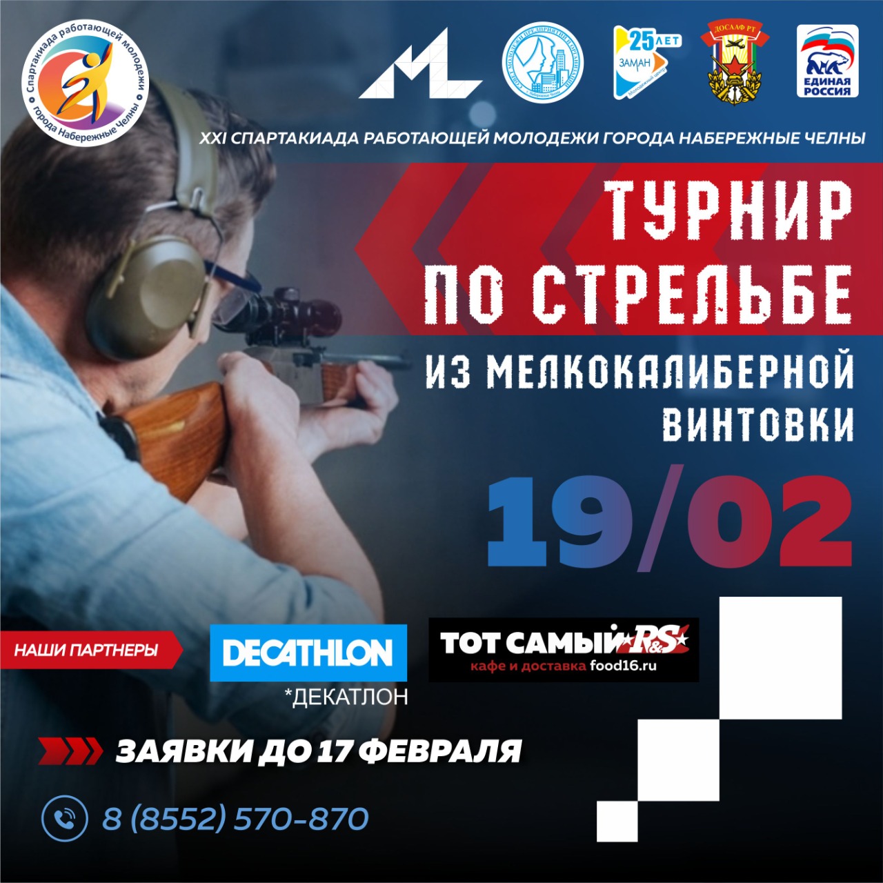 19 февральдә 10:00 сәгатьтә Татарстан Республикасы ДОСААФ тирында, XXI Спартакиада кысаларында, шәһәр предприятиеләре һәм оешмалары яшьләре арасында вак калибрлы винтовкадан ату буенча беренчелек узачак.